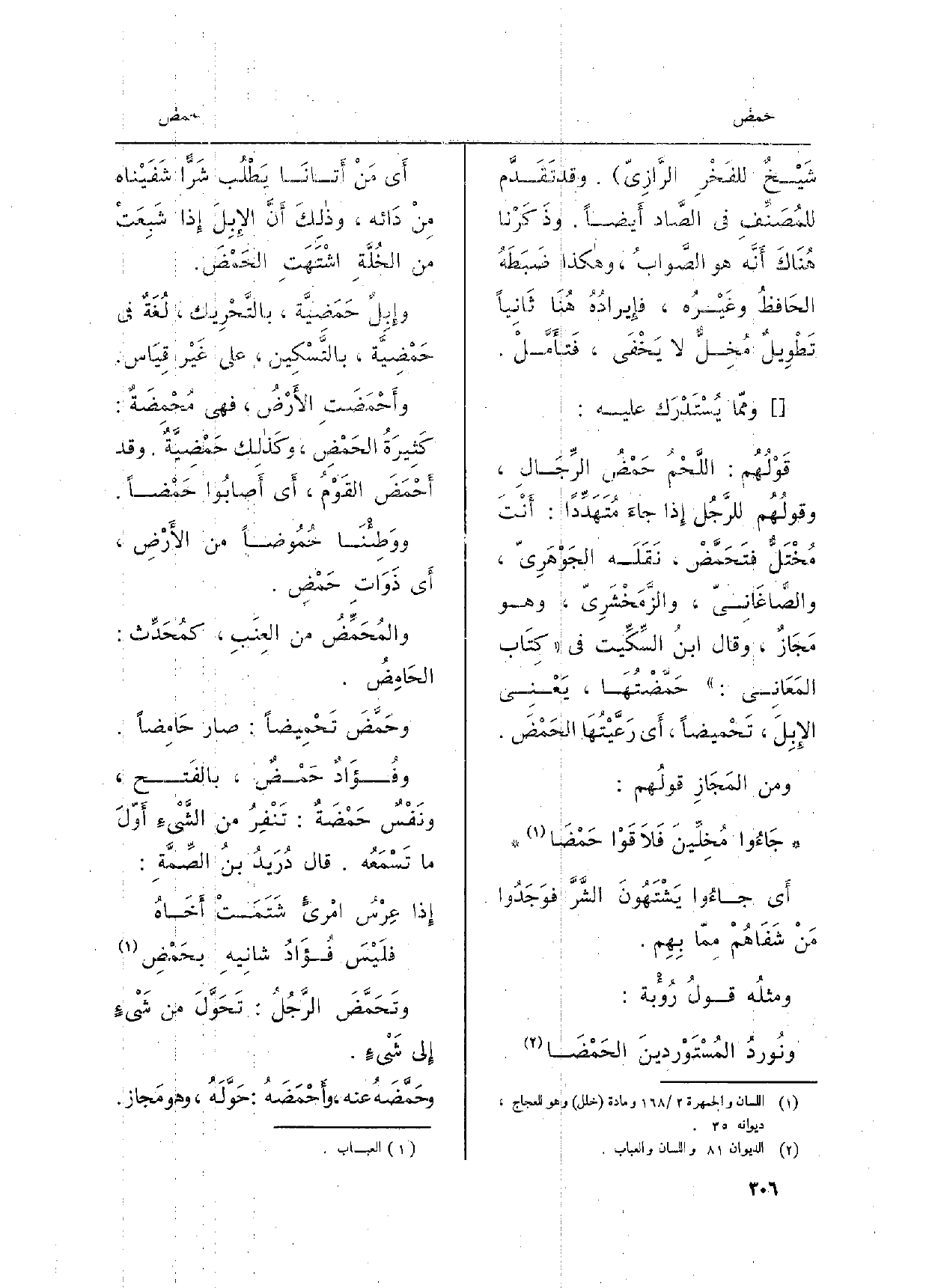 شَيْخٌ للفَخْرِ الرَّازِيّ. وَقد تَقَدَّم للمُصَنِّفِ فِي الصَّاد أَيضاً. وذَكَرْنا هُنَاكَ أَنَّه هُوَ الصَّوابُ، وَهَكَذَا ضَبَطَهُ الحَافظُ وغَيْرُه، فإِيرادُهُ هُنَا ثَانِياً تَطْوِيلٌ مُخِلٌّ لَا يَخْفَى، فَتأَمَّلْ. وممّ يُسْتَدْرَك عَلَيْهِ: قَوْلُهُم: اللَّحْمُ حَمْضُ الرِّجَالِ، وقَولُهُم للرَّجُل إِذَا جاءَ مُتَهَدِّداً: أَنْتَ مُخْتَلٌّ فتَحَمَّضْ، نَقَلَه الجَوْهَرِيّ، والصَّاغَانِيّ، والزَّمَخْشَرِيّ، وَهُوَ مَجَازٌ، وَقَالَ ابنُ السِّكِّيت فِي كِتَاب المَعَانِي: حَمَّضْتُهَا، يَعْنِي الإِبِلَ، تَحْمِيضاً، أَي رَعَّيْتُهَا الحَمْضَ. وَمن المَجَازِ قولُهم: جَاءُوا مُخِلِّينَ فَلاَقَوْا حَمْضَا أَي جاءُوا يَشْتَهُونَ الشَّرَّ فوَجَدُوا مَنْ شَفَاهُمْ مِمّا بِهِم. ومثلُه قولُ رُؤْبة: ونُورِدُ المُسْتَوْرِدينَ الحَمْضَا أَي مَنْ أَتانَا يَطْلُب شَرّاً شَفَيْنَاه مِنْ دَائه، وذلِكَ أَنَّ الإِبِلَ إِذا شَبِعَتْ من الخُلَّةِ اشْتَهَتِ الحَمْضَ.
