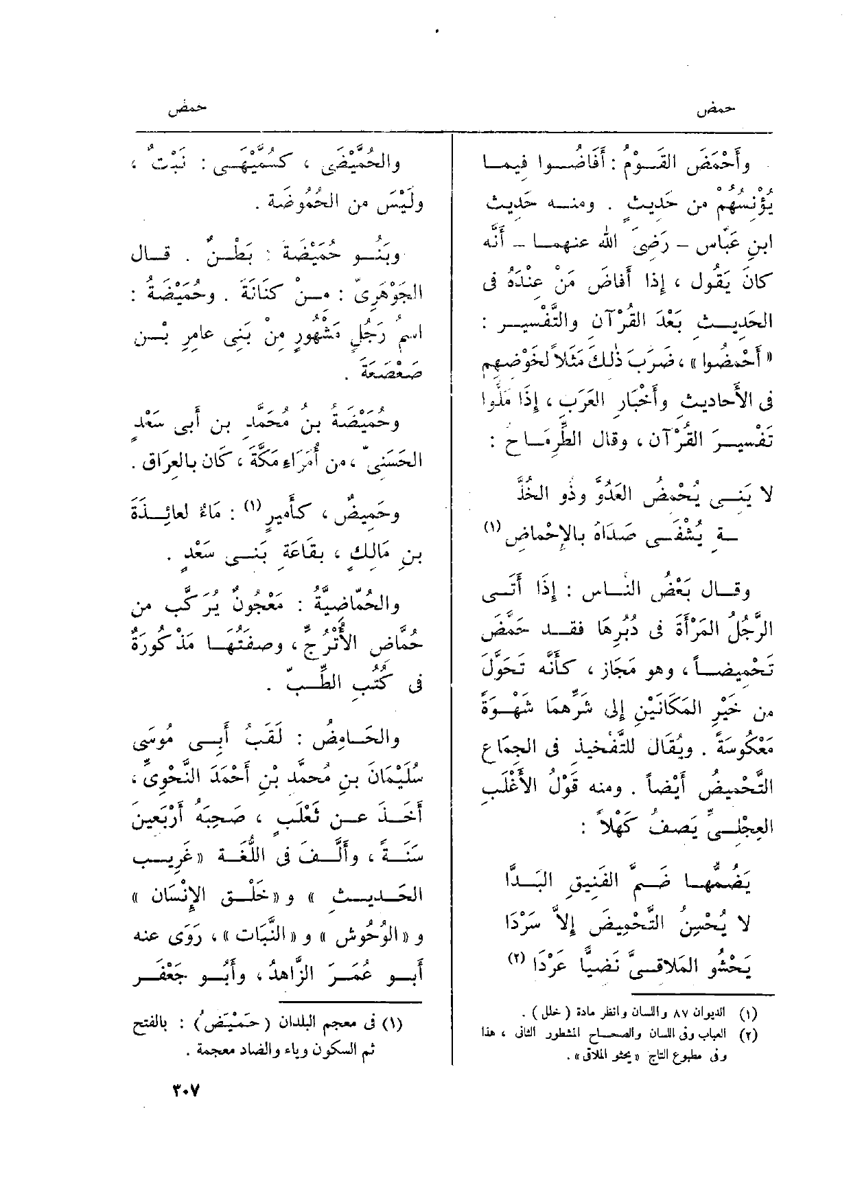 وَمِنْه قَوْلُ الأَغْلَبِ العِجْلِيِّ يَصِفُ كَهْلاً: يَضُمُّها ضَمَّ الفَنِيقِ البَدَّا لَا يُحْسِنُ التَّحْمِيضَ إِلاَّ سَرْدَا يَحْشُو المَلاقِيَّ نَضيّاً عَرْدَا والحُمَّيْضَى، كسُمَّيْهَى: نَبْتٌ، ولَيْسَ من الحُمُوضَة. وبَنُو حُمَيْضَةَ. بَطْنٌ. قَالَ الجَوْهَرِيّ: مِنْ كنَانَةَ. وحُمَيْضَةُ: اسمُ رَجُلٍ مَشْهُورٍ مِنْ بَنِي عامِرِ بْن صَعْصَعَةَ. وحُمَيْضَةُ بنُ مُحَمَّدِ بن أَبي سَعْدٍ الحَسَنِيّ، من أُمَرَاءِ مَكَّةَ، كَان بالعِرَاق. وحَمِيضٌ، كأَمِيرٍ: مَاءٌ لعائِذَةَ بنِ مَالِكٍ، بقَاعَةِ بَنِي سَعْدٍ. والحُمّاضِيَّةُ: مَعْجُونٌ يُرَكَّب من حُمَّاضِ الأُتْرُجِّ، وصِفَتُهَا مَذْكُورَةٌ فِي كُتُبِ الطِّبّ.