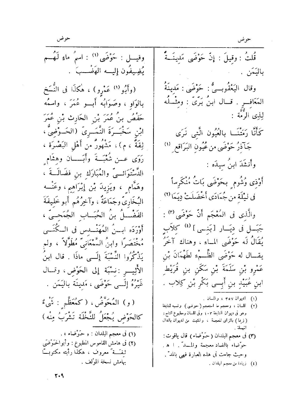 والَّذِي فِي المُعْجَم أَنّ حَوْضَى: جَبَل فِي دِيَار بَنِي كِلاَبٍ يُقَالُ لَه حَوْضَى الماءِ، وَهُنَاكَ آخَرُ يُقال لَهُ حَوْضَى الظِّمْءِ لطَهْمَانَ بْنِ عَمْرِو بْنِ سَلَمَةَ بْنِ سَكَنِ بنِ قُرَيْطِ ابنِ عُبَيْدِ بنِ أَبِي بَكْرِ بْنِ كِلاب. وَقيل: حَوْضَى: اسمُ ماءٍ لَهُم يُضِيفُون إِليه الهَضْبَ. وأَبُو عَمْرٍ و، هكذَا فِي النُّسَخ بالوَاوِ، وصَوَابُه أَبو عُمَرَ، واسمُه حَفْصُ بنُ عُمَرَ بْنِ الحَارِث بْنِ عُمَرَ ابْنِ سَخْبَرَةَ النَّمَرِيّ) } - الحَوْضِيُّ، ثِقَةٌ، م، مَشْهُورٌ من أَهْلِ البَصْرَة، رَوَى عَن شُعْبَةَ وأَبَان وهِشَامٍ الدَّسْتَوَائيّ والمُبَارَكِ بنِ فضَالَةَ، وهَمَّامٍ، ويَزِيدَ بْن إِبْرَاهيم، وعَنْه البُخَارِيّ وجَمَاعَةٌ، وآخِرُهُم أَبو خَلِيفَةَ الفَضْلُ بنُ الحُبَابِ الجُمَحِيّ، أَوْرَدَه ابنُ المُهَنْدِس فِي الكُنَى مُخْتَصَراً وابنُ السَّمْعَانِيّ مُطَوَّلاً، وَلم يَذْكُرُوا النِّسْبَةَ إِلَى مَاذَا. قَالَ ابنُ الأَثِير: نِسْبَة إِلى الحَوْضِ، وَقَالَ غَيْرُهُ إِلَى حَوْضَى، مَدِينَة باليَمَن. و {المُحَوَّضُ، كمُعَظَّمٍ: شَيْءٌ} - كالحَوْضِ يُجْعَلُ للنَّخْلَة تَشْرَبُ مِنْه