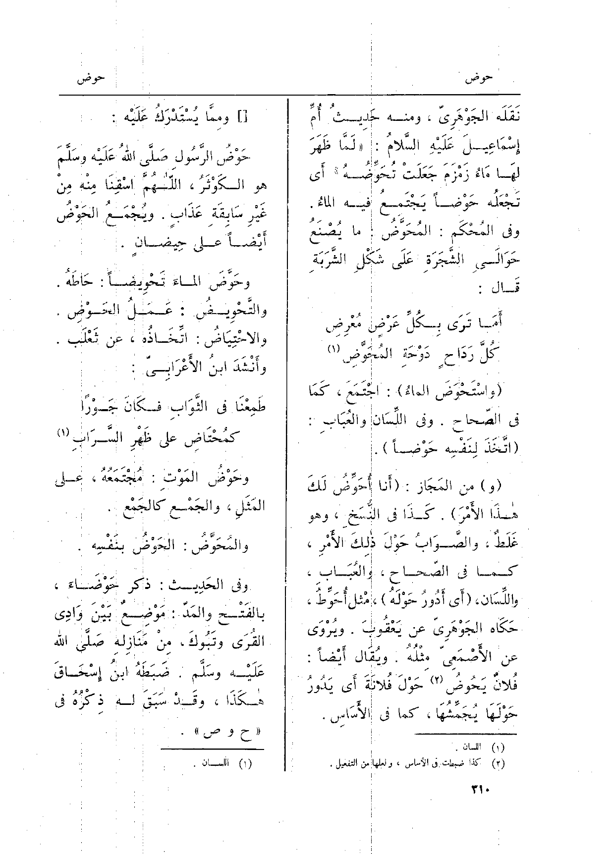 نَقَلَه الجَوْهَرِيّ، وَمِنْه حَدِيثُ أُمِّ إِسْمَاعِيلَ عَلَيْهِ السَّلامُ: لَمَّا ظَهَرَ لهَا ماءُ زَمْزَمَ جَعَلَتْ {تُحَوِّضُهُ أَي تَجْعَلُه} حَوْضاً يَجْتَمِعُ فِيهِ الماءُ. وَفِي المُحْكَم: {المُحَوَّضُ: مَا يُصْنَعُ حَوَالَيِ الشَّجَرَةِ عَلَى شَكْلِ الشَّرَبَةِ قَال: أَمَا تَرَى بِكُلِّ عَرْضٍ مُعْرِضِ كُلَّ رَدَاحٍ دَوْحَةِ المُحَوَّضِ واستَحْوَضَ الماءُ: اجْتَمَعَ، كَمَا فِي الصّحاح. وَفِي اللّسَان والعُبَابِ: اتَّخَذَ لِنَفْسِه حَوْضاً. من المَجَاز: أَنا أَحَوِّضُ لَكَ هذَا الأَمْرَ. كَذَا فِي النُّسَخِ، وَهُوَ غَلَطٌ، والصَّوَابُ حَوْلَ ذلِكَ الأَمْرِ، كَمَا فِي الصّحاح، والعُبَابِ، واللِّسَان، أَي أَدُورُ حَوْلَهُ، مثْل أُحَوِّطُ، حَكَاه الجَوْهَرِيّ عَن يَعْقُوبَ.