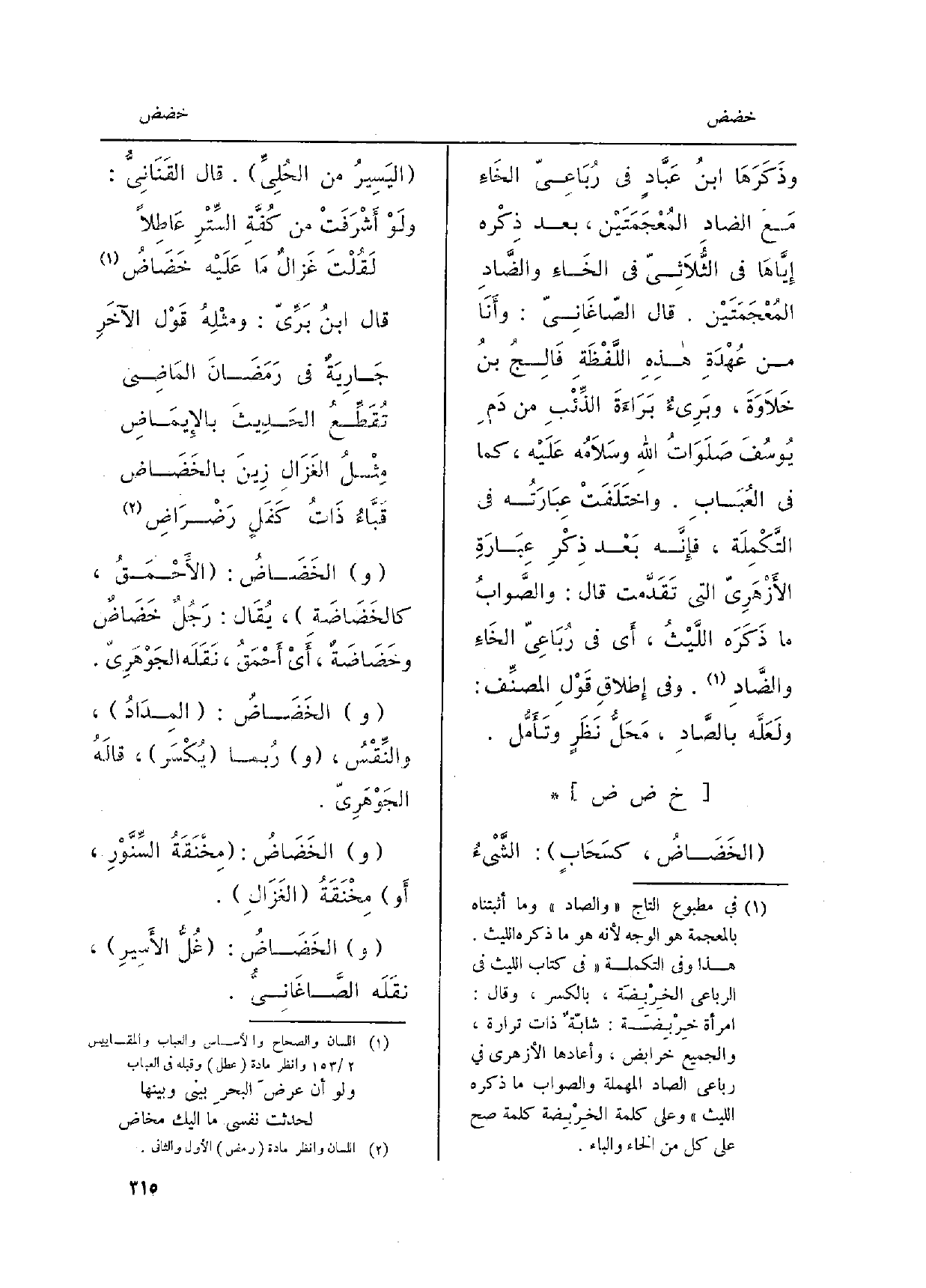 قَالَ ابنُ بَرِّيّ: ومثْلِهُ قوْل الآخَرِ جَارِيَةٌ فِي رَمَضَانَ المَاضِي تُقَطِّعُ الحَدِيثَ بالإِيمَاضِ مِثْلُ الغَزَالِ زِينَ بالخَضَاض قَبَّاءُ ذَاتُ كَفَلٍ رَضْرَاضِ و} الخَضَاضُ: الأَحْمَقُ، كالخَضَاضَةِ، يُقَال: رَجُلٌ! خَضَاضٌ وخَضَاضَةٌ، أَيْ أَحْمَقُ، نَقَلَه الجَوْهَرِيّ. الخَضَاضُ: المِدَادُ، والنِّقْسُ، رُبما يُكْسَر، قالَهُ الجَوْهَرِيّ. الخَضَاضُ: مِخْنَقَةُ السَّنَّوْرِ، أَو مِخْنَقَةُ الغَزَالِ. الخَضَاضُ: غُلُّ الأَسِيرِ، نقَلَه الصَّاغَانِيُّ.