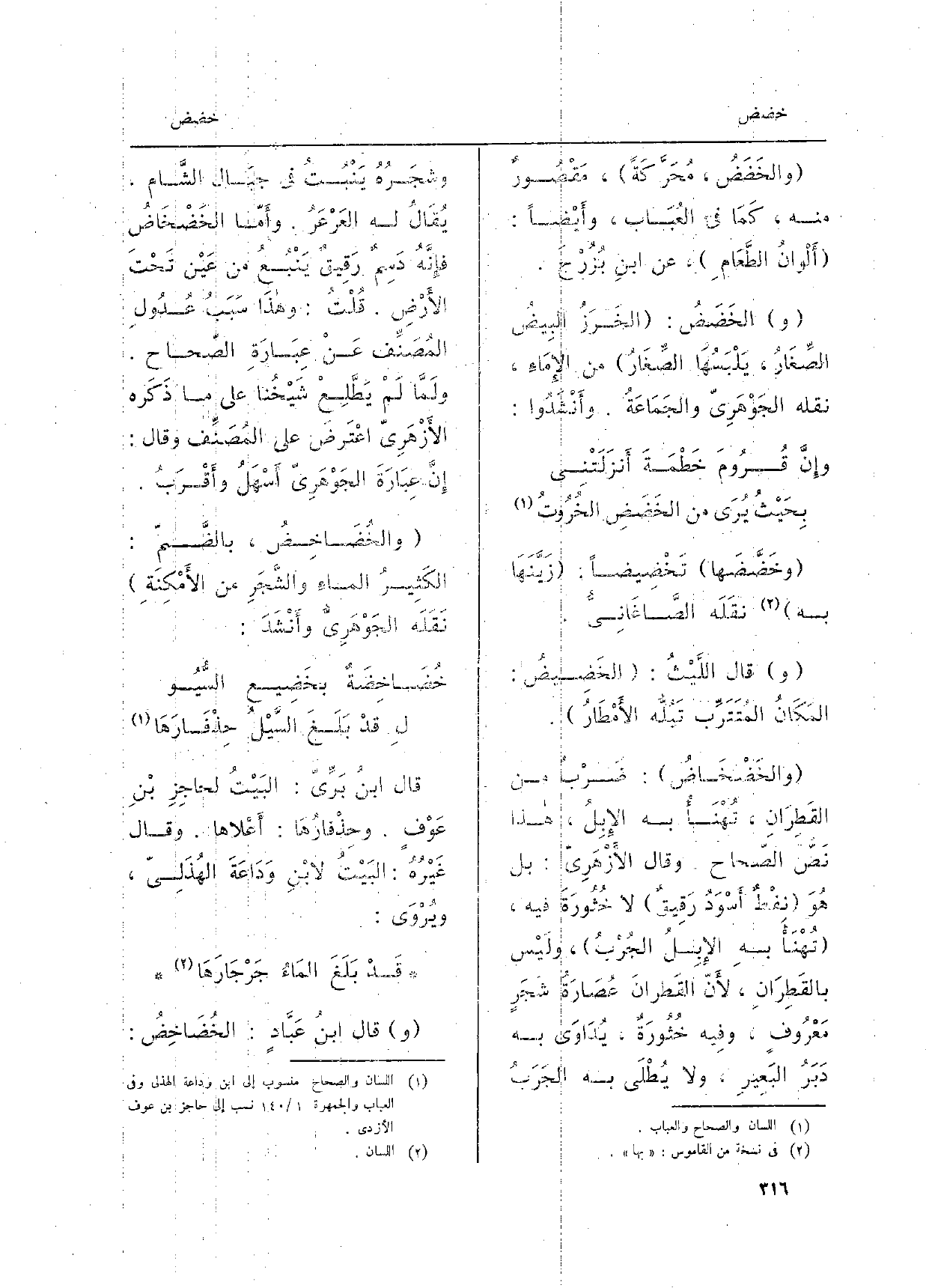 ) } وخَضَّضَها {تَخْضِيضاً: زَيَّنَهَا بِهِ نقَلَه الصَّاغَانِيُّ. قَالَ اللَّيْثُ:} الخَضِيضُ: المَكَانُ المُتَتَرِّب تَبُلُّه الأَمْطَارُ. {والخَضْخَاضُ: ضَرْبٌ من القَطِرَانِ، تُهْنَأُ لَهُ الإِبِلُ، هَذَا نَصُّ الصَّحاح وَقَالَ الأَزْهَرِيّ: بل هُوَ نِفْطٌ أَسْوَدُ رَقِيقٌ لَا خُثُورَةَ فِيهِ، تُهْنَأُ بهِ الإِبِلُ الجُرْبُ، ولَيْس بالقَطِرَانِ، لأَنّ القَطرانَ عُصَارَةُ شَجَرٍ مَعْرُوفٍ، وفِيه خُثُورَةٌ، يُدَاوَى بِهِ دَبَرُ البَعِيرِ، وَلَا يُطْلَى بِهِ الجَرَبُ وشَجَرُهُ يَنْبُتُ فِي جبَال الشَّام، يُقَالُ لَهُ العَرْعَرُ. وأَمّا} الخَضْخَاضُ فإِنَّهُ دَسِمٌ رَقِيقٌ يَنْبُعُ من عَيْن تَحْتَ الأَرْضِ. قُلْتُ: وهذَا سَبَبُ عُدُولِ المُصَنِّفُ عَنْ عِبَارَةِ الصّحاح. ولَمَّا لَمْ يَطَّلِعْ شَيْخُنا على مَا ذَكَره الأَزْهَرِيّ اعْتَرضَ على المُصَنِّف وَقَالَ: إِنَّ عِبَارَةُ الجَوْهَرِيّ أَسْهَلُ وأَقْرَبُ. {والخُضَاخِضُ، بالضَّمّ: الكَثِيرُ الماءِ والشَّجَرِ من الأَمْكِنَةِ نَقَلَه الجَوْهَرِيُّ وأَنْشَدَ: