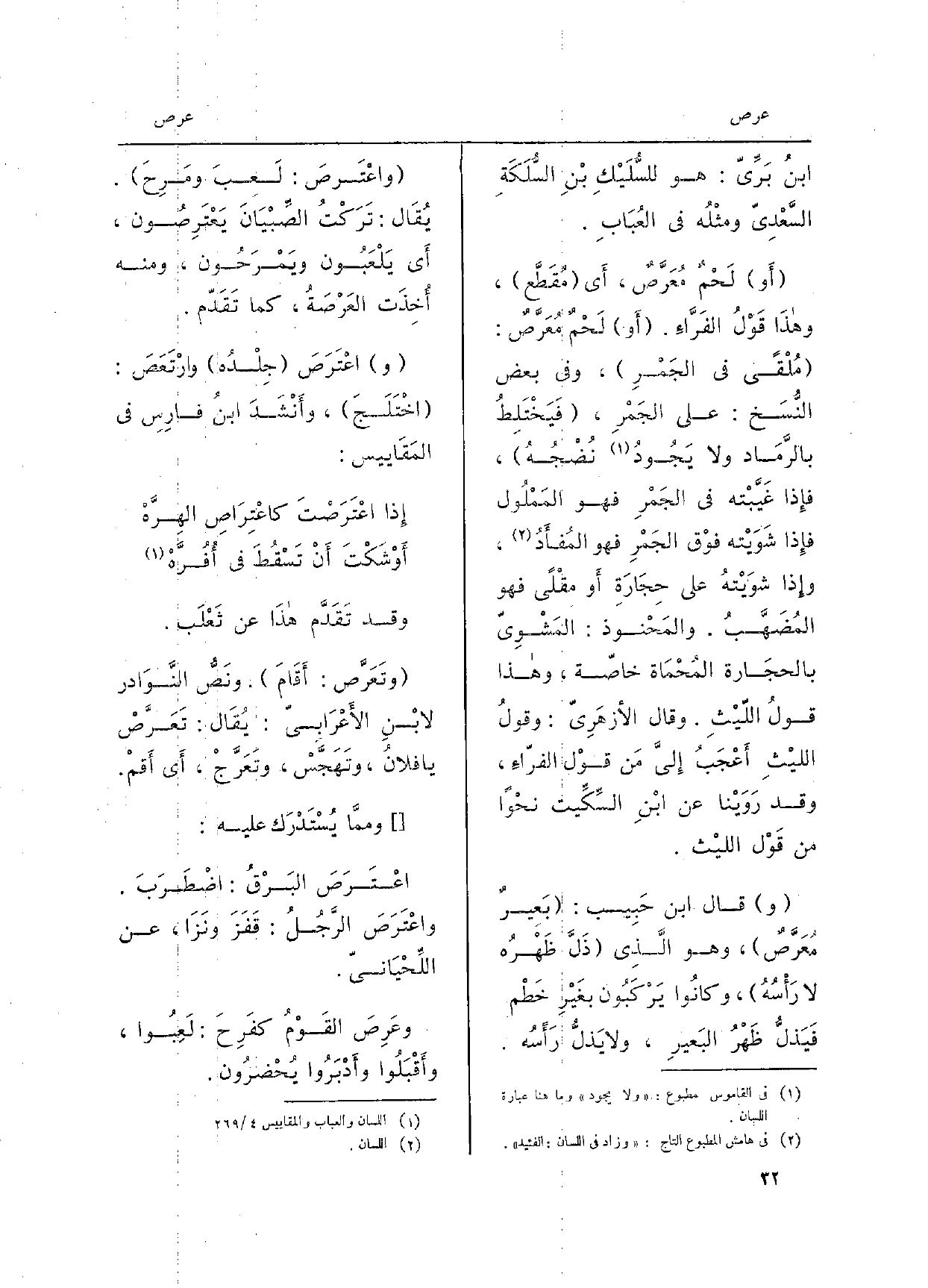 وَقَالَ ابنُ بَرِّيّ: هُوَ للسُّلَيْكِ بْنِ السُّلَكَةِ السَّعْدِيّ ومثْلُه فِي العُبَابِ. أَو لَحْمٌ مُعَرَّصٌ، أَي مُقَطَّع، وهذَا قَوْلُ الفَرَّاءِ. أَو لَحْمٌ مُعَرَّصٌ: مُلْقىً فِي الجَمْرِ، وَفِي بعض النًّسَخ: على الجَمْرِ، فَيَخْتَلِطُ بالرَّمَاد وَلَا يَجُودُ نُضْجُهُ، فإِذا غَيَّبْته فِي الجَمْرِ فَهُوَ المَمْلُول فإِذا شَوَيْته على حِجَارَةِ أَو مِقْلىً فَهُوَ المُضَهَّبُ. والمَحْنوذ: المَشْوِيّ بالحجَارة المُحْمَاة خاصّة، وَهَذَا قولُ اللّيْثِ. وَقَالَ الأَزهَرِيّ: وقولُ الليْثِ أَعْجَبُ إِلىَّ مَن قوْل الفرّاءِ، وَقد رَوَيْنا عَن ابْنِ السِّكِّيت نحْواً من قَوْلِ الليْث. قَالَ ابْن حَبِيب: بَعِيرٌ مُعَرَّصٌ، وَهُوَ الَّذِي ذَلَّ ظَهْرُه لَا رَأْسُهُ، وكانُوا يَرْكَبُون بغَيْرِ خَطْمٍ فَيَذلُّ ظَهْرُ البَعيرِ، وَلَا يَذلُّ رَأْسُه. واعْتَرصَ: لَعِبَ ومَرِحَ. يُقَال: تَرَكْتُ الصِّبْيَانَ يَعْتَرِصُون، أَي يَلْعَبُون ويَمْرَحُون، وَمِنْه أُخِذَت العَرْصَةُ، كَمَا تَقَدّم.