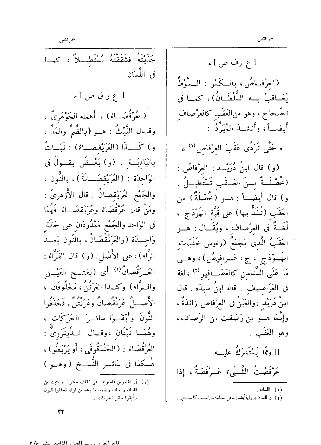 العُرْقُصَاءُ، أَهمله الجَوْهَرِيّ، وَقَالَ اللَّيْثُ: هُوَ بالضَّمِّ والمَدِّ، كَذَا العُرَيْقِصاءُ: نَبَاتٌ بالبَادِيَةِ. بَعْضٌ يقولُ فِي الوَاحِدَة: العُرَيْقِصَانَةُ، بالنُّون، والجَمْع العُرَيْقِصانُ. قَالَ الأَزهريّ: ومَنْ قَالَ عُرْقُصَاءُ وعُرَيْقصَاءُ فَهُمَا فِي الوَاحد والجَمْع مَمْدُودَانِ على حَالَةٍ وَاحِدَة والعَرَنْقُصَانُ، بالنّون بَعد الرَّاء، على الأَصْلِ. قَالَ الفَرَّاءُ: العَرَقُصانُ أَي بِفَتْح العَيْنِ والرَّاءِ وَكَذَا العَرَتُنُ، مَحْذُوفَان الأَصلُ عَرَنْقُصانُ وعَرَنْتُنٌ، فَحَذَفُوا النُّونَ وأَبْقَوْا سائرَ الحَرَكَاتِ، وهُمَا نَبْتَانِ، وَقَالَ الدِّينَوَرِيُّ: العُرْقُصَاءُ: الحَنْدَقُوقَى، أَو يَرْبَطُو، هَكَذَا فِي سَائر النُّسخ وَهُوَ