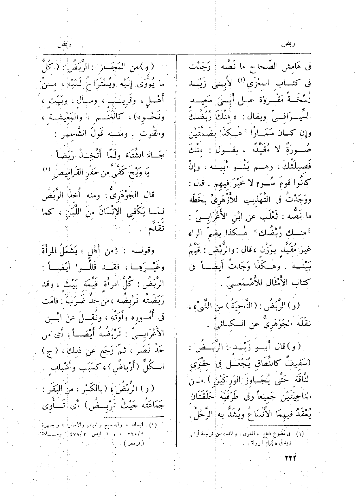 هَامِش الصّحاح مَا نَصَّه: وَجَدْت فِي كتابِ المِعْزَى لأَبِي زَيْد نُسْخةً مَقْرؤة على أَبِي سَعِيدٍ السِّيرَافِيّ وَيُقَال: مِنْكَ رُبُضُكَ وإِن كانَ سَمَاراً هكذَا بضَمَّتَيْن صُورَةً لَا مُقَيَّدَاً، يَقُول: مِنْكَ فَصِيلَتُكَ، وهم بَنُو أَبْيه، وإِنْ كانُوا قومَ سُوءٍ لَا خَيْرَ فِيهِم. قَالَ: ووَجَدْتُ فِي التَّهْذِيب للأَزْهَرِيِّ بخَطّه مَا نَصُّه: ثَعْلَب عَن ابْنِ الأَعْرَابِيّ: مِنْك رُبْضُك هَكَذَا بضمّ الراءِ غير مُقَيَّدٍ بوَزْنٍ، قَالَ: والرُّبْض: قَيِّمُ بَيْته. وهكَذَا وَجَدْتُ أَيضاً فِي كتاب الأَمْثَال للأَصْمَعِيّ. الرَّبَضُ: النَّاحِيَةُ من الشَّيْءِ، نَقَلَه الجَوْهَرِيُّ عَن الكِسَائيّ. قَالَ أَبو زَيْدٍ: الرَّبَضُ: سَقِيفٌ كالنِّطَاقِ يُجْعَل فِي حِقْوَىِ النَّاقَةِ حَتَّى يُجَاوِزَ الوَرِكَيْنِ من الناحِيَتَيْنِ جَمِيعاً وَفِي طَرِفَيْه حَلْقَتَانِ يُعْقَدُ فيهِمَا الأَنْسَاعُ ويُشَدُّ بِهِ الرَّحْلُ. من المَجَازِ: الرَّبَضُ: كُلُّ مَا يُؤْوَى إِلَيْه ويُسْتَرَاحُ لَدَيْه، مِنْ أَهْلٍ، وقَرِيبٍ، ومالٍ، وبَيْتٍ، ونَحْوِه، كالغَنَمِ، والمَعِيشةِ، والقُوتِ، وَمِنْه قَولُ الشَّاعِر: