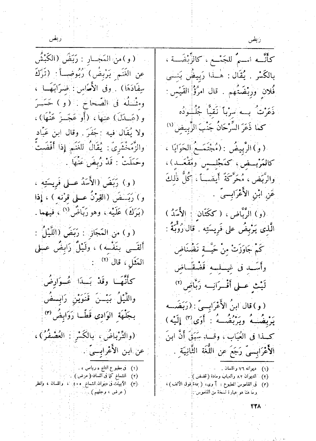 الرَّبِيضُ: مُجْتَمَعُ الحَوَايَا، كالمَرْبضِ، كمَجْلِسٍ ومَقْعَدٍ، والرَّبَض، مُحَرَّكَةً أَيضاً، كُلُّ ذلِكَ عَنِ ابْنِ الأَعْرَابِيّ. الرَّبَّاض، ككَتّانٍ: الأَسَدُ الَّذِي يَرْبِضُ على فَرِيسَتِه. قَالَ رُؤْبَةُ: كَمْ جَاوَزَتْ مِنْ حَيَّةٍ نَضْنَاضِ وأَسَدٍ فِي غِيلِهِ قَضْقَاضِ لَيْثٍ على أَقْرَانِه رَبَّاضِ قَالَ ابنُ الأَعْرَابِيّ: رَبَضَه يَرْبِضُهُ ويَرْبُضُهُ: أَوَى إِلَيْه كَذَا فِي العُبَاب، وَقد سَبَقَ أَنَّ ابنَ الأَعْرَابِيّ رَجَعَ عَن اللُّغَة الثَّانِيَةِ. من المَجازِ: رَبَضَ الكَبْشُ عَن الغَنَمِ يَرْبِضُ رُبُوضاً: تَرَكَ سِفَادَهَا. وَفِي الأَسَاسِ: ضِرَابَهَا، ومِثْلُه فِي الصّحاح. حَسَرَ وعَدَلَ عَنْهَا، أَو عَجَزَ عَنْهَا، وَلَا يُقَال فِيهِ: جَفَرَ. وَقَالَ ابْن عَبّادٍ والزَّمَخْشَرِيّ: يُقَالُ للغَنَم إِذا أَفْضَتْ وَحَمَلَتْ: قَدْ رُبِضَ عَنْهَا. رَبَضَ الأَسَدُ على فَرِيسَتِه، رَبَضَ: القِرْنُ على قِرْنِه، إِذا بَرَكَ عَلَيْه، وَهُوَ رَبّاضٌ، فيهمَا.