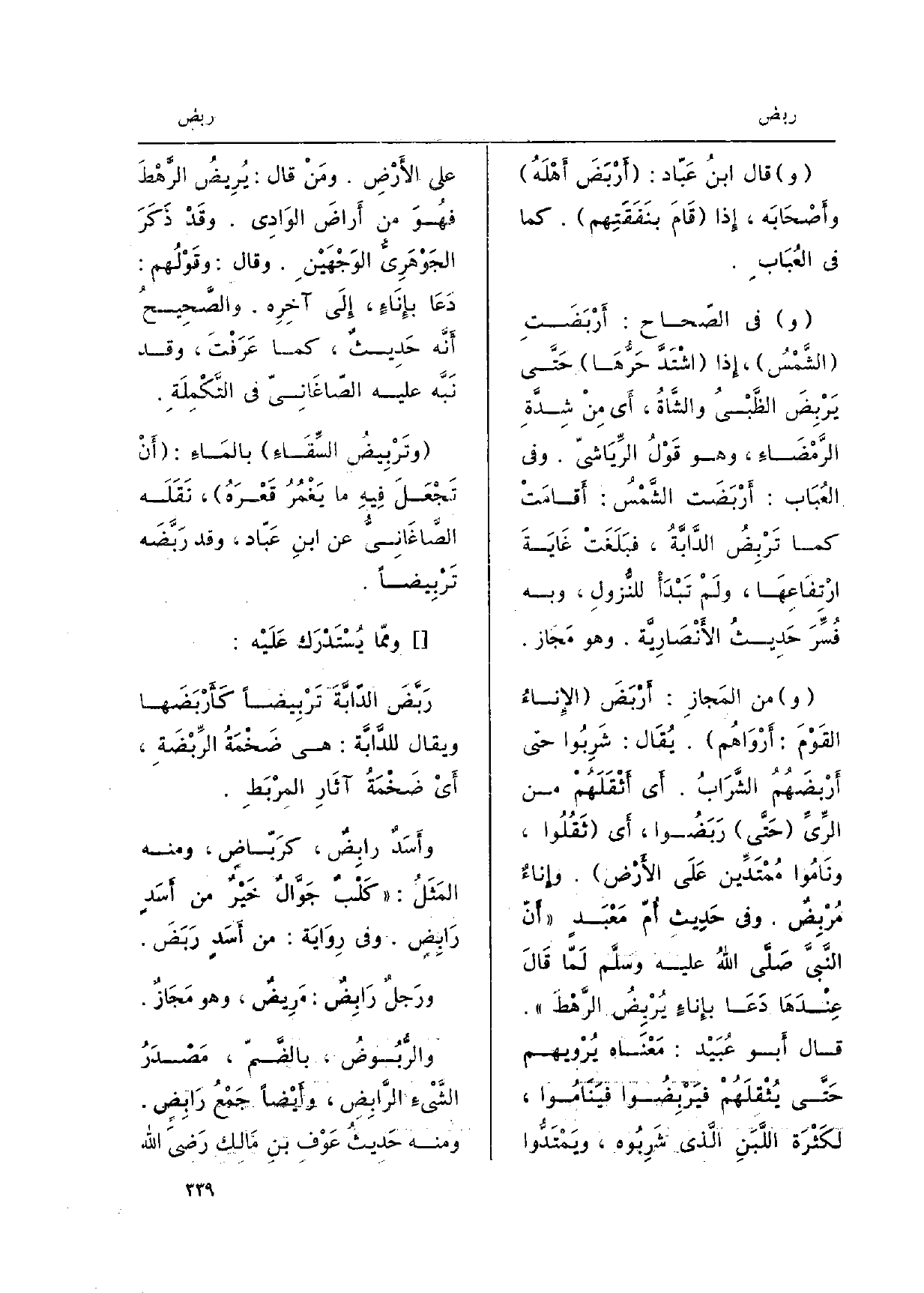 وَقَالَ: وقَوْلُهم: دَعَا بإِنَاءٍ، إِلَى آخِرِه. والصَّحِيحُ أَنَّه حَدِيثٌ، كَمَا عَرَفْتَ، وَقد نَبَّه عَلَيْهِ الصّاغَانِيّ فِي التَّكْمِلَةِ. وتَرْبِيضُ السِّقَاءِ بالمَاءِ: أَنْ تَجْعَلَ فِيهِ مَا يَغْمُرُ قَعْرَهُ، نَقَلَه الصَّاغَانِيُّ عَن ابْن عَبّاد، وَقد رَبَّضَه تَرْبِيضاً. وممّا يُسْتَدْرَك عَلَيْه: رَبَّضَ الدّابَّةَ تَرْبِيضاً كَأَرْبَضَها وَيُقَال للدَّابَّة: هِيَ ضَخْمَةُ الرِّبْضَةِ، أَي ضَخْمَةُ آثَارِ المرْبَطِ. وأَسَدٌ رابِضٌ، كرَبّاضِ، وَمِنْه المَثَلُ: كَلْبٌ جَوَّالٌ خَيْرٌ من أَسَدٍ رَابِضِ. وَفِي رِوَايَة: من أَسَدٍ رَبَضَ. ورَجلٌ رَابِضٌ: مَرِيضٌ، وَهُوَ مَجَازٌ. والرُّبُوضُ، بالضَّمّ، مَصْدَرُ الشَّيْءِ الرَّابِضِ، وأَيْضاً جَمْعُ رَابِضٍ. وَمِنْه حَدِيثُ عَوْفِ بن مَالك رَضِيَ الله