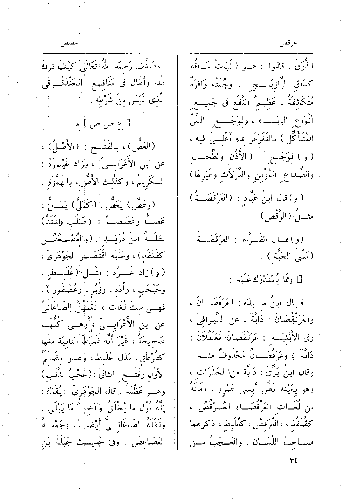 الذُّرَقُ. قَالُوا: هُوَ نَبَاتٌ سَاقُه كسَاقِ الرَّازِيَانجِ، وجُمَّتُه وَافِرَةٌ مُتَكَاثِفَةٌ، عَظِيمُ النَّفْع فِي جَمِيعِ أَنْوَاعِ الوَبَاءِ، ولِوَجَعِ السِّنّ المُتَأَكِّل بالتَّغَرْغُر بماءٍ أُغْلِيَ فِيهِ، لِوَجَعِ الأُذُنِ والطِّحالِ والصُّداعِ المُزْمِنِ والنَّزَلاَتِ وغَيْرِهَا قَالَ ابنُ عَبَّادٍ: العَرْقَصَةُ مثلُ الرَّقْص قَالَ الفَرَّاء: العَرْقَصَةُ: مَشْيُ الحَيَّةِ. وممّا يُسْتَدْرَك عَلَيْه: قَالَ ابنُ سِيدَه: العَرَقُصَانُ، والعَرَنْقُصَانُ: دَابَّةٌ، عَن السِّيرافِيّ، وَفِي الأَبْنِيَةِ: عَرَنْقُصانُ فَعَنْلُلاَنُ: دَابَّةٌ، وعَرَقُصَانُ مَحْذُوفٌ مِنْهُ. وَقَالَ ابنُ بَرِّيّ: دَابَّة من الحَشَراتِ. وَهُوَ بِعَيْنه نَصُّ أَبِي عَمْرٍ و، وفَاتَهُ من لُغَاتِ العُرْقُصَاءِ العُرْقُصُ، كقُنْفُذ، والعُرَقِصُ، كعُلَبِطٍ، ذكرهمَا صاحِبُ اللِّسَان. والعَجَبُ من المُصَنِّف رَحِمَه اللهُ تَعَالَى كَيْفَ تركَ هذَا وأَطَال فِي مَنَافِع)