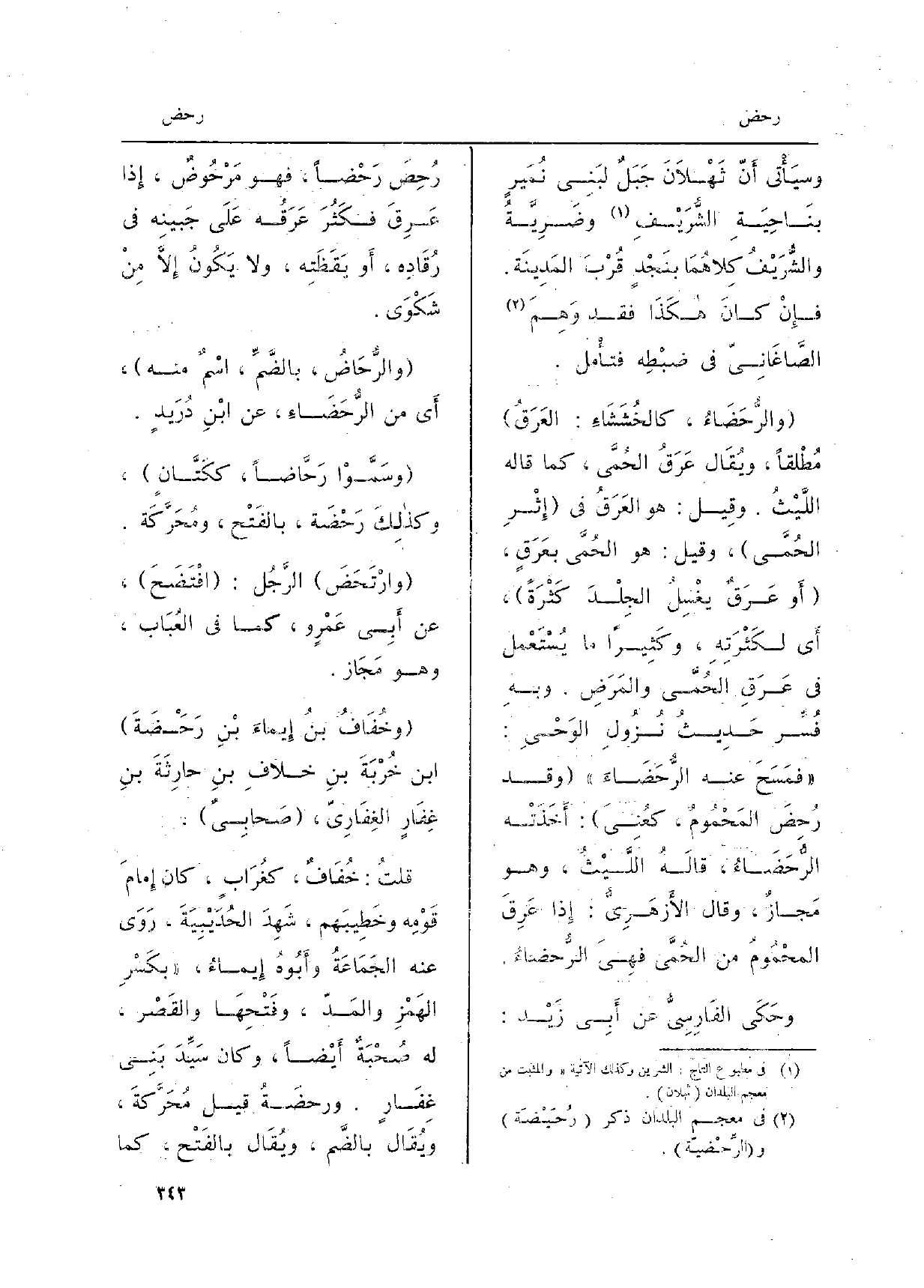 وسيَأْتي أَنّ ثَهْلاَنَ جَبَلٌ لبَنِي نُمَيْرٍ بنَاحِيَةِ الشُّرَيْفِ وضَرِيَّةُ والشُّرَيْفُ كِلاهُمَا بنَجْدٍ قُرْبَ المَدِينَة. فإِنْ كانَ هكَذَا فقد وَهِمَ الصَّاغَانِيّ فِي ضبْطِه فَتَأمل. والرُّحَضَاءُ، كالخُشَشَاءِ: العَرَقُ مُطْلقاً، ويُقَال عَرَقُ الحُمَّى، كَمَا قَالَه اللَّيْثُ. وَقيل: هُوَ العَرَقُ فِي إِثْرِ الحُمَّى، وَقيل: هُوَ الحُمَّى بعَرَقٍ، أَو عَرَقٌ يغسِلُ الجِلْدَ كَثْرَةً، أَي لكَثْرَتِهِ، وكَثِيراً مَا يُسْتَعْمل فِي عَرَقِ الحُمَّى والمَرَضِ. وبهِ فُسِّر حَدِيثُ نُزُولِ الوَحْيِ: فمَسَحَ عَنهُ الرُّحَضَاءَ وَقد رُحِضَ المَحْمُومُ، كعُنِيَ: أَخَذَتْه الرُّحَضَاءُ، قالَهُ اللَّيْثُ، وَهُوَ مَجازٌ، وَقَالَ الأَزهَرِيُّ: إِذا عَرِقَ المحْمُومُ من الحُمَّى فهِيَ الرُّحضاءُ. وحَكَى الفَارِسيُّ عَن أَبِي زَيْد: رُحِصَ رَحْضاً، فَهُوَ مَرْحُوضٌ، إِذا عَرِقَ فكَثُرَ عَرَقُه عَلَى جَبينِه فِي رُقَادِه، أَو يَقَظَتِه، وَلَا يَكُونُ إِلاَّ مِنْ شَكْوَى. والرُّحَاضُ، بالضَّمِّ، اسْمٌ مِنْهُ، أَي من الرُّحَضَاءِ، عَن ابْنِ دُرَيْدٍ. وسَمَّوْا رَحَّاضاً، ككَتَّانٍ، وكذلِكَ رَحْضَة، بالفَتْح، ومُحَرَّكَة. وارْتَحَضَ الرَّجُل: افْتَضَحَ، عَن أَبِي عَمْرْو، كَمَا فِي العُبَاب، وَهُوَ مَجَاز. وخُفَافُ بنُ إِيماءَ بْنِ رَحَضَةَ ابْن خُرْبَةَ بنِ خلافِ بنِ حارِثَةَ بنِ غِفَارٍ الغِفَارِيّ، صَحابِيٌ. قلتُ: خُفَافٌ، كغُرَابٍ، كَانَ إِمامَ قَوْمِه وخَطِيبَهم، شَهِدَ الحُدَيْبِيَةَ، رَوَى عَنهُ الجَمَاعَةُ وأَبُوهُ إِيماءُ، بكَسْرِ الهَمْزِ والمَدّ، وفَتْحِهَا والقَصْر، لَهُ صُحْبَةٌ أَيْضاً، وَكَانَ سَيِّدَ بَنِي غِفَارٍ. ورحضَةُ قيل مُحَرَّكةَ، وبُقَال بالضَّم، ويُقَال بالفَتْح، كَمَا