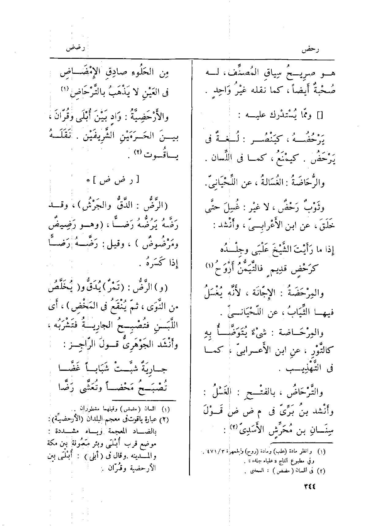 والمِرْحَضَةُ: الإِجّانَة، لأَنَّه يُغْسَلُ فِيهَا الثِّيَابُ، عَن اللّحْيَانِيّ. والمِرْحَاضَة: شَيْءٌ يُتَوَضَّأُ بِهِ كالتَّوْرِ، عَن ابْن الأَعرابِيّ، كَمَا فِي التَّهْذِيب. والتَّرْحَاضُ، بالفَتْحِ: الغَسْلُ: وأَنْشَد بن بَرِّيّ فِي م ض ض قَوْلَ سِنَانِ بن مُحَرِّشٍ الأَسَدِيّ: مِن الحَلُوءِ صادِقِ الإِمْضَاضِ فِي العَيْنِ لَا يَذْهَبُ بالتَّرْحَاضِ والأَرْحَضِيَّةُ: وَادٍ بَيْنَ أُبْلَى وقُرّانَ، بينَ الحَرَمَيْنِ الشَّرِيفَيْن. نَقَلَهْ ياقُوت.