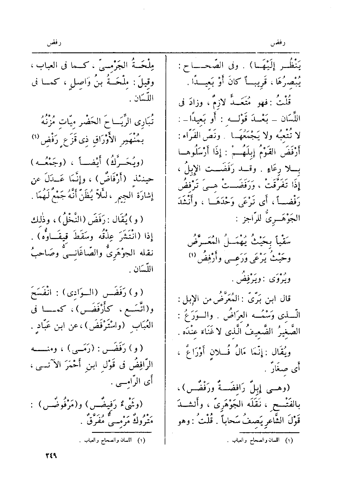 ويُحَرَّكُ أَيْضاً، وجَمْعُه حينئذٍ أَرْفَاضٌ، وإِنَّمَا عَدَلَ عَن إِشارَة الجِيمِ، لئَلاّ يُظَنّ أَنَّهُ جَمْعٌ لَهُمَا. يُقَال: رَفَضَ النَّخْلُ، وذلِك إِذا انْتَشَرَ عِذْقُه وسَقَطَ قِيقَاؤُه. نَقله الجَوْهَرِيُّ والصّاغَانِيُّ وصَاحبُ اللّسَان. رَفَضَ الوَادِي: انْفَسَحَ واتَّسَع، كأَرْفَضَ، كَمَا فِي العُبَابِ واسْتَرْفَضَ، عَن ابْن عَبّادٍ. رَفَضَ: رَمَى، وَمِنْه الرّافِضُ فِي قَوْلِ ابنِ أَحْمَرَ الْآتِي، أَي الرّامِي. وشَيْءٌ رَفِيضٌ ومَرْفُوضٌ: مَتْرُوكٌ مَرْمِيٌّ مَفُرَّقٌ.