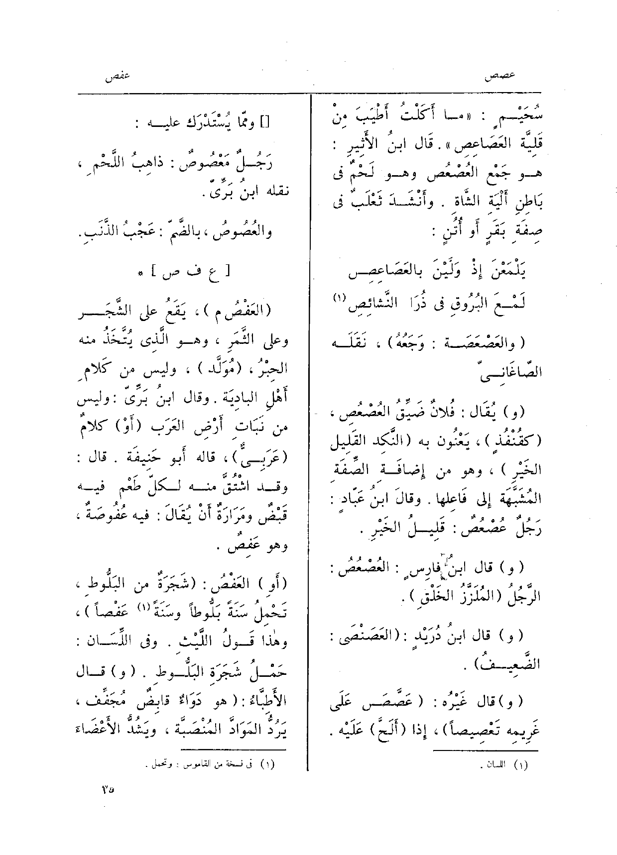 قَالَ: وَقد اشْتُقَّ مِنْهُ لكلّ طَعْم فِيهِ قَبْضٌ ومَرَارَةٌ أَنْ يُقَالَ: فِيهِ عُفُوصَةٌ، وَهُوَ عَفِصٌ. العَفْصُ: شَجَرَةٌ من البَلُّوطِ، تَحْمِلُ سَنَةً بَلُّوطاً وسَنَةً عَفْصاً، وَهَذَا قَولُ اللَّيْثِ. وَفِي اللِّسَان: حَمْلُ شَجَرَةِ البَلُّوطِ. وَقَالَ الأَطِبَّاءُ: هُوَ دَوَاءٌ قابِضٌ مُجَفِّف يَرُدُّ المَوَادَّ المُنْصِبَّة، ويَشُدُّ الأَعْضَاء