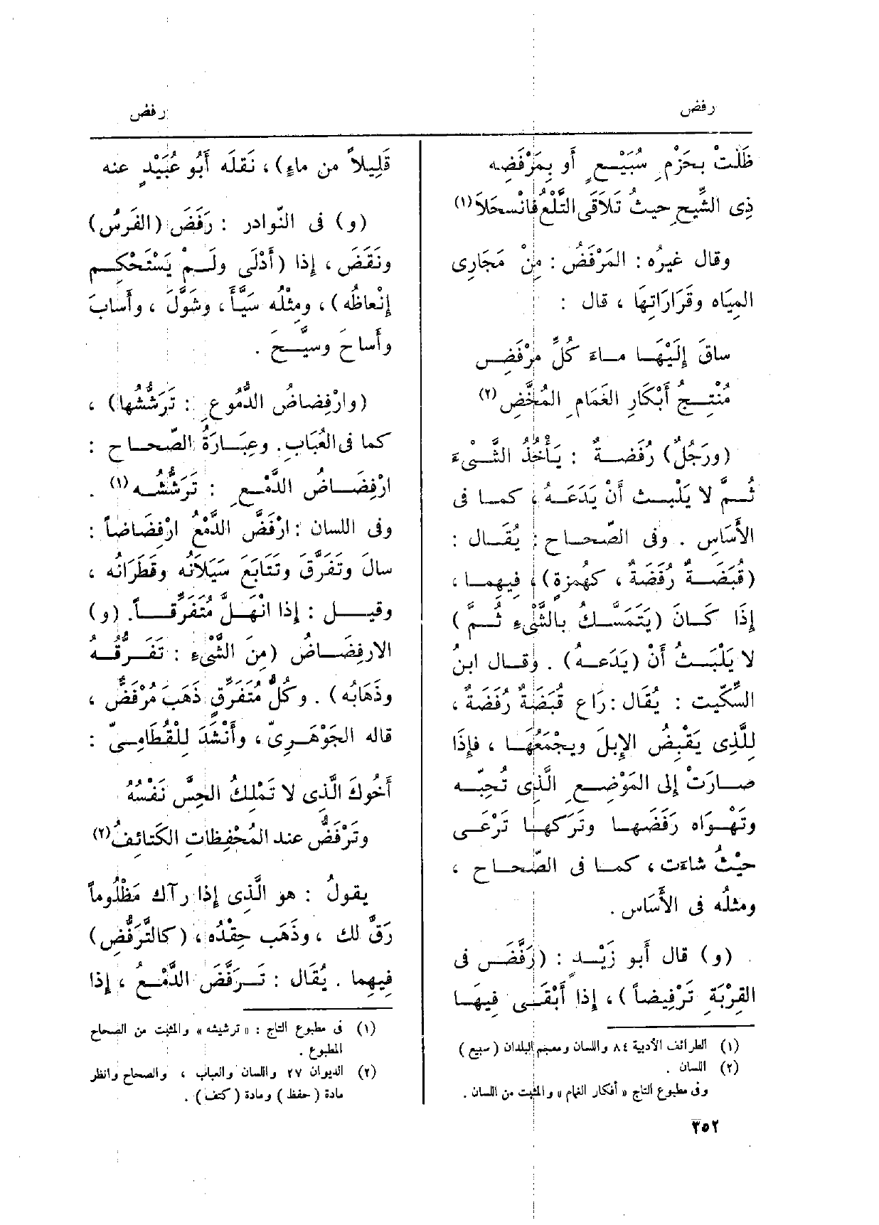 وَقَالَ غيرُه: المَرْفَضُ: مِنْ مَجَارِي المِيَاه وقَرَارَاتِهَا، قَالَ: ساقَ إِلَيْهَا ماءَ كُلِّ مرْفَضِ مُنْتِجُ أَبْكَارِ الغَمَامِ المُخَّضِ ورَجُلٌ رُفَضةٌ: يَأْخُذُ الشَّيْءَ ثُمَّ لَا يَلْبَث أَن يَدَعَهُ، كَمَا فِي الأَسَاسِ. وَفِي الصّحاح: يُقَال: قُبَضَةٌ رُفَضَةٌ، كهُمزةٍ، فِيهِما، إِذَا كَانَ يَتَمَسَّكُ بالشَّيْءِ ثُمَّ لَا يَلْبَثُ أَنْ يَدَعهُ. وَقَالَ ابنُ السِّكّيت: يُقَال: رَاع قُبَضَةٌ رُفَضَةٌ، لِلَّذِي يَقْبِضُ الإِبلَ ويجْمَعُهَا، فإِذَا صارَتْ إِلى المَوْضِعِ الَّذِي تُحِبّه وتَهْوَاه رَفَضَها وتَرَكها تَرْعَى حيْثُ شاءَت، كَمَا فِي الصّحاح، ومثلُه فِي الأَسَاس. قَالَ أَبو زَيْدٍ: رَفَّضَ فِي القِرْبَةِ تَرْفِيضاً، إِذا أَبْقَى فِيهَا قَلِيلاً م ماءٍ، نَقلَه، أَبُو عُبَيْدٍ عَنهُ فِي النّوادر: رَفَضَ الفَرسُ ونَقَضَ، إِذا أَدْلَى ولَمْ يَسْتَحْكِم إِنْعاظُه، ومِثْلُه سَيَّأَ، وشَوَّلَ، وأَسابَ وأَساحَ وسيَّحَ. وارْفِضاضُ الدُّمُوعِ: تَرَشُّشُها، كَمَا فِي العُبَابِ. وعِبَارَةُ الصّحاح: ارْفِضَاضُ الدَّمْعِ: تَرَشُّشُه. وَفِي اللِّسَان: ارْفَضَّ الدَّمْعُ ارْفِضَاضاً: سالَ وتَفَرَّقَ وتَتَابَعَ سَيَلاَنُه وقَطَرَانُه، وَقيل: إِذا انْهَلَّ مُتَفَرِّقاً. الارفِضَاضُ مِنَ الشَّيْءِ: تَفَرُّقُهُ وذَهَابُه. وكُلُّ مُتَفَرِّقٍ ذَهَبَ مُرْفَضٌّ، قَالَه الجَوْهَرِيّ، وأَنْشَدَ لِلْقُطَامِيّ: