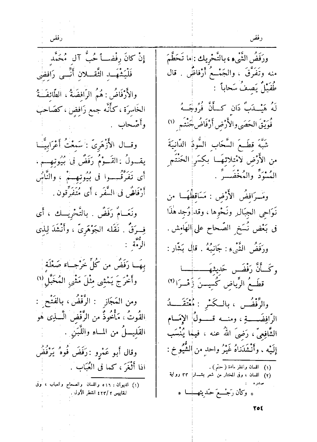 والأَرْفَاضُ: هُمُ الرّافِضَةُ، الطّائِفَةُ الخَاسِرَة، كأَنَّه جمع رَافِضٍ، كصَاحب وأَصْحاب. وَقَالَ الأَزْهَرِيّ: سَمِعْتُ أَعْرَابِيّاً يقولُ: القَوْمُ رَفَضٌ فِي بُيُوتِهم. أَي تَفَرَّقُوا فِي بُيُوتِهِمْ، والنَّاسُ أَرْفَاضٌ فِي السَّفَر، أَي مُتَفَرِّقون. ونَعَامٌ رَفَضٌ. بالتَّحْرِيك، أَي فِرَقٌ. نَقَله الجَوْهَرِيّ، وأَنْشَدَ لِذِي الرُّمَّةِ: