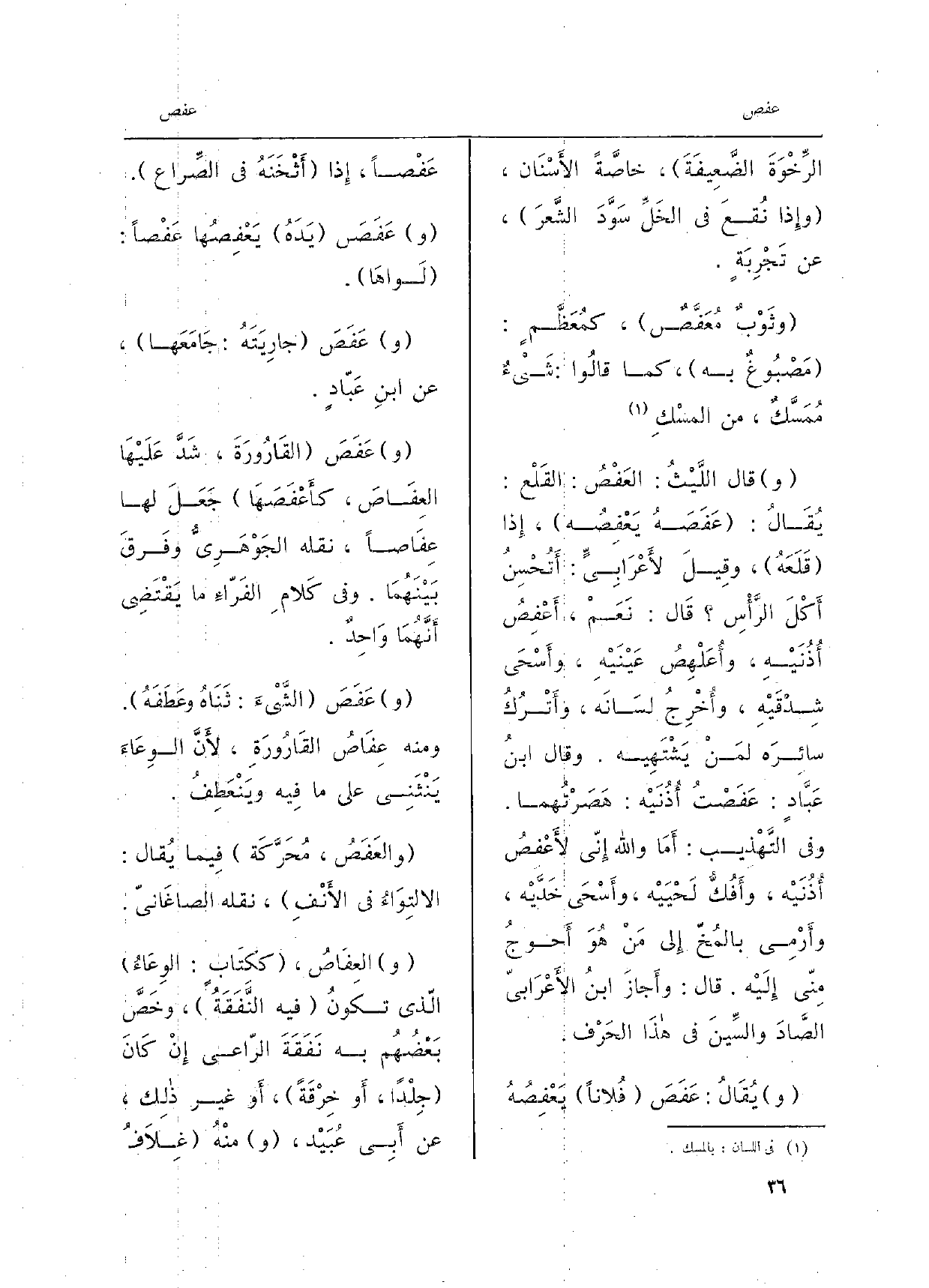 َ الرِّخْوَةَ الضَّعِيفَةَ، خاصَّةً الأَسْنَان، وإِذا نُقِعَ فِي الخَلِّ سَوَّدَ الشَّعرَ، عَن تَجْرِبَةٍ. وثَوْبٌ مُعَفَّصٌ، كمُعَظَّمٍ: مَصْبُوغٌ بِهِ، كَمَا قالُوا: شَيْءٌ مُمَسَّكٌ، من المِسْكِ قَالَ اللَّيْثُ: العَفْصُ: القَلْع: يُقَالُ: عَفَصَةً يَعْفِصُه، إِذا قَلَعَهُ، وقِيلَ لأَعْرَابِيٍّ: أُتُحْسِنُ أَكْلَ الرَّأْسِ قَال: نَعَمْ، أَعْفِصُ أُذُنَيْهِ، وأُعَلْهِصُ عَيْنَيْهِ، وأَسْحَى شِدْقَيْهِ، وأُخْرِجُ لِسَانَه، وأَتْرُكُ سائِرَه لمَنْ يَشْتَهِيه. وَقَالَ ابنُ عَبَّادٍ: عَفَصْتُ أُذُنَيْه: هَصَرْتُهما. وَفِي التَّهْذِيب: أَمَا وَالله إِنّي لأَعْفِصُ أُذُنَيْه، وأَفُكُّ لَحْيَيْه، وأَسْحَى خَدَّيْه، وأَرْمِى بالمُخّ إِلى مَنْ هُوَ أَحوجُ مِنّي إِلَيْه. قَالَ: وأَجازَ ابنُ الأَعْرَابيّ الصَّادَ والسِّينَ فِي هذَا الحَرْف. يُقَالُ: عَفَصَ فُلاناً يَعْصُهُ عَفْصاً، إِذا أَثْخَنَهُ فِي الصِّراع. عَفَصَ يَدَهُ يَعْفِصُها عَفْصاً: لَواهَا. عَفَصَ جارِيَتَهُ: جَامَعَها، عَن ابْن عَبَّادٍ. عَفَصَ القَارُورَةَ، شَدَّ عَلَيْهَا العِفَاصَ، كأَعْفَصَهَا جَعَلَ لَهَا عِفَاصاً، نَقله الجَوْهَرِيُّ وفَرقَ بَيْنَهُمَا. وَفِي كَلامِ الفَرّاءِ مَا يَقْتَضِي أَنَّهُمَا وَاحِدٌ. عَفَصَ الشَّيْءَ: ثَنَاهُ وعَطَفَهُ. وَمِنْه عِفَاصُ القَارُورَةِ، لأَنَّ الوِعَاءَ يَنْثَنِي على مَا فِيهِ ويَنْعَطِفُ. والعَفَصُ، مُحَرَّكَة فِيما يُقال: الالتِوَاءُ فِي الأَنْفِ، نَقله الصاغَانيّ. العِفَاصُ، ككِتَابٍ: الوِعَاءُ الّذي تكونُ فِيهِ النَّفَقَةُ، وخَصَّ بَعْضُهُم بِهِ نَفَقَةَ الرّاعِي إِنْ كَانَ جِلْداً، أَو خِرْقَةً، أَو غير ذلِك، عَن أَبِي عُبَيْد، منْهُ غِلاَف