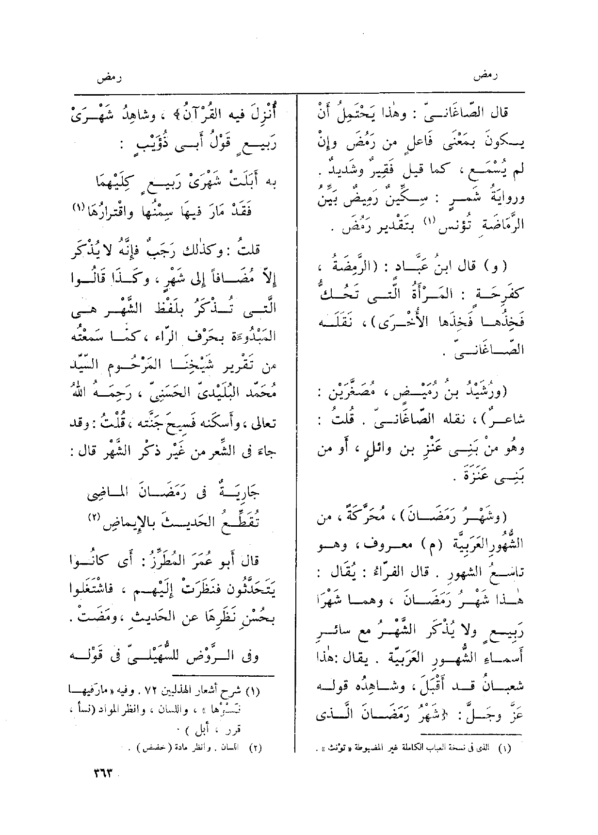 قَالَ الصّاغَانيّ: وَهَذَا يَحْتَمِلُ أَنْ يكونَ بمَعْنَى فَاعِلٍ من رَمُضَ وإِنْ لم يُسْمَع، كَمَا قيل فَقِيرٌ وشَديدٌ. وروايَةُ شَمرٍ: سِكِّينٌ رَمِيضٌ بَيِّنُ الرَّمَاضَةِ تُؤنس بتَقْدير رَمُضَ. قَالَ ابنُ عَبَّادٍ: الرَّمِضَةُ، كفَرِحَة: المَرْأَةُ الّتي تَحُكُّ فَخِذُها فَخِذَها الأُخْرَى، نَقَلَه الصّاغَانيّ. ورُشَيْدُ بنُ رُمَيْضٍ، مُصَغَّرَيْن: شاعرٌ، نَقله الصّاغَانيّ. قُلتُ: وهُو منْ بَنِي عَنْزِ بن وائلٍ، أَو من بَنِي عَنَزَةَ. وشَهْرُ رَمَضَانَ، مُحَرَّكَةً، من الشُّهُورِ العَرَبِيَّة م مَعْرُوف، وَهُوَ تاسعُ الشهورِ. قَالَ الفرّاءُ: يُقَال: هَذَا شَهْرُ رَمَضَانَ، وهما شَهْرَا رَبِيعٍ وَلَا يُذْكَر الشَّهْرُ مَعَ سائرِ أَسماءِ الشُّهورِ العَرَبيّة. يُقَال: هَذَا شعبانُ قد أَقْبَلَ، وشاهِدُه قَوْله عَزَّ وجَلَّ: شَهْرُ رَمَضَانَ الَّذي أُنْزِلُ فِيهِ القُرْآنُ، وشاهِدُ شَهْرَيْ رَبيعٍ قَوْلُ أَبي ذُؤَيْبٍ: