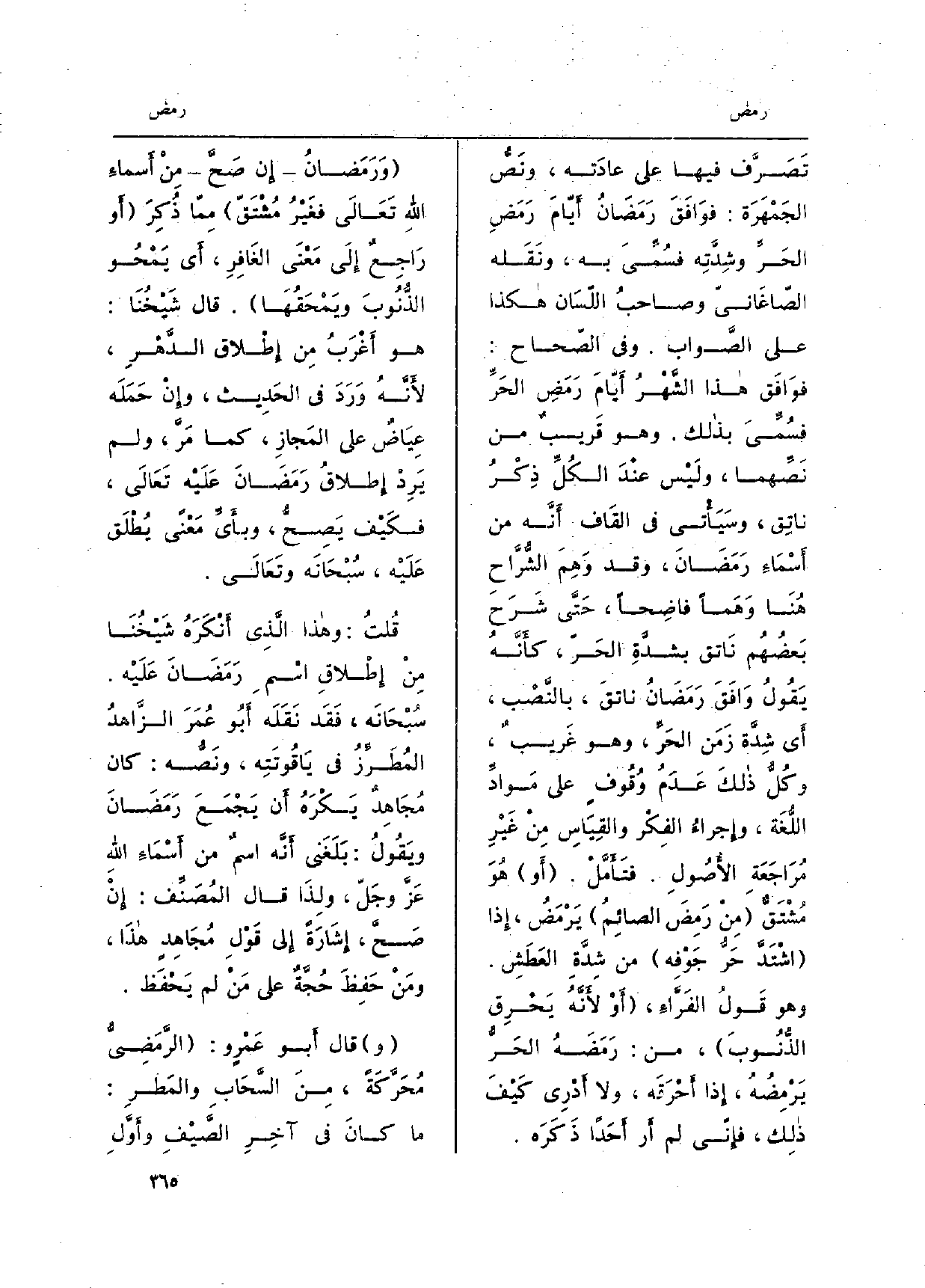 تَصَرَّف فِيهَا على عادَته، ونَصُّ الجَمْهَرَة: فوَافَقَ رَمَضَانُ أَيّامَ رَمَضِ الحَرِّ وشِدَّتِه فسُمِّيَ بِهِ، ونَقَله الصّاغَانيّ وصاحبُ اللّسَان هَكَذَا على الصَّواب. وَفِي الصّحاح: فوَافَق هَذَا الشَّهْرُ أَيّامَ رَمَضِ الحَرِّ فسُمِّيَ بذلك. وَهُوَ قَريبٌ من نَصِّهما، ولَيْس عنْدَ الكُلِّ ذِكْرُ ناتِق، وسَيَأْتي فِي القَاف أَنَّه من أَسْمَاءِ رَمَضَانَ، وَقد وَهِمَ الشُّرَّاحِ هُنَا وَهْماً فاضِحاً، حَتَّى شَرَحَ بَعضُهُم نَاتق بشدَّةِ الحَرّ، كأَنَّهُ يَقُولُ وَافَقَ رَمَضَانُ ناتقَ، بالنَّصْبِ، أَي شِدَّة زَمَن الحَرِّ، وَهُوَ غَريبٌ، وكُلُّ ذلكَ عَدَمُ وُقُوفٍ على مَوادِّ اللُّغَة، وإِجراءُ الفِكْر والقِيَاسِ مِنْ غَيْرِ مُرَاجَعَةِ الأُصُولِ. فتَأَمَّلْ. أَو هُوَ مُشْتَقٌّ مِنْ رَمِضَ الصائِمُ يَرْمَضُ، إِذا اشْتَدَّ حَرُّ جَوْفِه من شِدَّةِ العَطَشِ. وَهُوَ قَولُ الفَرَّاءِ، أَوْ لأَنَّهُ يَحْرِق الذُّنُوبَ، من: رَمَضَهُ الحَرُّ يَرْمِضُهُ، إِذا أَحْرَقَه، وَلَا أَدْرِي كَيْفَ ذلِك، فإِنّي لم أَر أَحداً ذَكَرَه. وَرَمَضانٌ إِن صَحَّ مِنْ أَسماءِ اللهِ تَعَالَى فغَيْرُ مُشْتَقّ مِمّا ذُكِرَ أَو رَاجِعٌ إِلَى مَعْنَى الغَافِر، أَي يَمْحُو الذُّنُوبَ ويَمْحَقُهَا. قَالَ شَيْخُنَا: هُوَ أَغِرَبُ مِن إِطْلاق الدَّهْرِ، لأَنَّهُ وَرَدَ فِي الحَدِيث، وإِنْ حَمَلَة عِيَاضٌ على المَجَازِ، كَمَا مَرَّ، وَلم يَرِدْ إِطلاقُ رَمَضَانَ عَلَيْه تَعَالَى، فكَيْف يَصِحُّ، وبأَيِّ مَعْنىً يُطْلَق عَلَيْه، سُبْحَانَه وتَعَالَى. قُلْتُ: وَهَذَا الَّذِي أَنْكَرَهُ شَيْخُنَا مِنْ إِطْلاقِ اسْمِ رَمَضَانَ عَلَيْه. سُبْحَانَه، فَقَد نَقَلَه أَبُو عُمَرَ الزَّاهدُ المُطَرِّزُ فِي يَاقُوتَتِه، ونَصُّه: كَانَ مُجَاهِدٌ يَكْرِهُ أَن يَجْمَعَ رَمَضَانَ ويَقُولُ: بَلَغَني أَنَّه اسمٌ من أَسْمَاءِ اللهِ عَزَّ وجَلّ، ولِذَا قَالَ المُصَنِّف: إِنْ صَحَّ، إِشَارَةً إِلى قَوْلِ مُجَاهدٍ هذَا، ومَنْ حَفِظَ حُجَّةٌ على مَنْ لم يَحْفَظ. قَالَ أَبُو عَمْرٍ و: الرَّمَضِيُّ مُحَرَّكَةً، مِنَ السَّحَابِ والمَطَرِ: مَا كانَ فِي آخِرِ الصَّيْفِ وأَوَّلِ