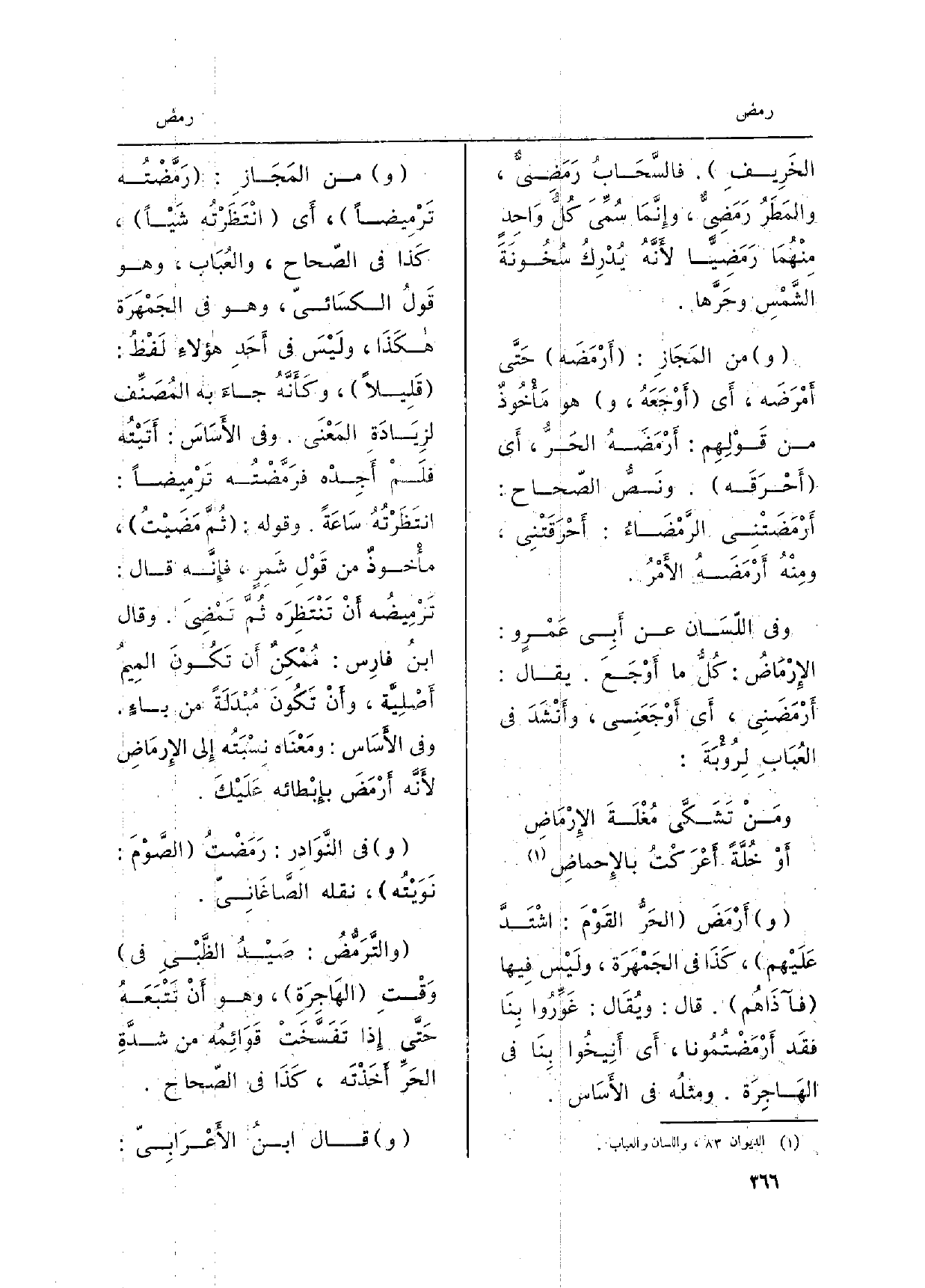 المَجَازِ: أَرْمَضَه حَتَّى أَمْرَضَه، أَي أَوْجَعَهُ، وَهُوَ مَأْخُوذٌ من قَوْلِهِم: أَرْمَضَهُ الحَرُّ، أَي أَحْرَقَه. ونَصُّ الصّحاح: أَرْمَضَتْنِي الرَّمْضَاءُ: أَحْرَقَتْنِي، ومِنْهُ أَرْمَضَهُ الأَمْرُ. وَفِي اللّسَان عَن أَبِي عَمْرٍ و: الإِرْمَاضُ: كُلُّ مَا أَوْجَعَ. يُقَال: أَرْمَضَنِي، أَي أَوْجَعَنِي، وأَنْشَدَ فِي العُبَابِ لِرُؤْبَةَ: ومَنْ تَشَكَّى مُغْلَةَ الإِرْمَاضِ أَو خُلَّةً أَعْرَكْتُ بالإِحْماضِ أَرْمَضَ الحَرُّ القَوْمَ: اشْتَدَّ عَلَيْهم، كَذَا فِي الجَمْهَرَة، ولَيْس فِيها فآذَاهُم. قَالَ: ويُقَال: غُوَّرُوا بِنَا فقَد أَرْمَضْتُمُونا، أَي أَنِيخُوا بِنَا فِي الهَاجِرَة. ومثلُه فِي الأَسَاسِ. من المَجَازِ: رَمَّضْتُه تَرْمِيضاً، أَي انْتَظَرْتُه شَيْاً، كَذَا فِي الصّحاح، والعُبَاب، وَهُوَ قَولُ الكسَائيّ، وَهُوَ فِي الجَمْهَرَة هكَذَا، ولَيْسَ فِي أَحَدِ هؤلاءِ لَفْظُ: قَلِيلاً، وكَأَنَّهُ جاءَ بِهِ المُصَنِّف لِزِيَادَة المَعْنَى. وَفِي الأَسَاسَ: أَتَيْتُه فلَمْ أَجِدْه فرَمَّضْتُه تَرْمِيضاً: انتَظَرْتُهُ سَاعَةً. وَقَوله: ثُمَّ مَضَيْتُ، مأَخْوذٌ من قَوْلِ شَمِرٍ، فإِنَّه قَالَ: تَرْمِيضُه أَنْ تَنْتَظِرَه ثُمَّ تَمْضِيَ. وَقَالَ ابنُ فارِس: مُمْكِنٌ أَن تَكُونَ المِيمُ أَصْلِيَّة، وأَنْ تَكُونَ مُبْدَلَةً من باءٍ. وَفِي الأَسَاس: ومَعْنَاه نِسْبَتُه إِلى الإِرمَاضِ لأَنَّه أَرْمَضَ بإِبْطْائه عَلَيْكَ. فِي النَّوَادِر: رَمَضْتُ الصَّوْمَ: نَوَيْتُه، نَقله الصَّاغَانِيّ. والتَّرَمُّضُ: صَيْدُ الظَّبْيِ فِي وَقْتِ الهَاجِرَةِ، وَهُوَ أَنْ تَتْبَعَهُ حَتَّى إِذا تَفَسَّخَتْ قَوَائِمُه من شدَّةِ الحَرِّ أَخْذْتَه، كَذَا فِي الصّحاح. قَالَ ابنُ الأَعْرَابِيّ: