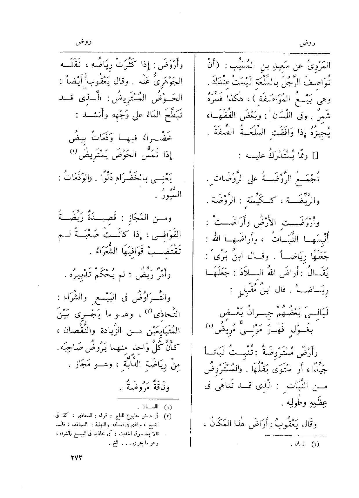 المَرْوِيّ عَن سَعِيدِ بن المُسَيِّب: أَنْ تُوَاصِفَ الرَّجُلَ بالسِّلْعَةِ لَيْسَتْ عِنْدَكَ. وَهِي بَيْعُ المُوَاصَفَةِ، هَكَذَا فَسَّرَهُ شَمِرٌ. وَفِي اللّسَان: وبَعْضُ الفُقَهَاءِ يُجِيزُهُ إِذا وَافَقَتِ السِّلْعَةُ الصِّفَةَ. وممّا يُسْتَدْرَك عَلَيْهِ: تُجْمَعُ الرَّوْضَةُ على الرَّوْضَاتِ.