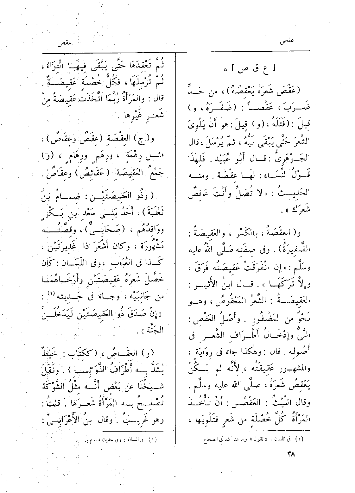 وَمِنْه الحَدِيث: لَا تُصَلِّ وأَنْتَ عَاقِصٌ شَعرَك. والعِقْصَةُ، بالكَسْر، والعِقِيصَةُ: الضَّفِيرَةُ. وَفِي صِفَتِه صَلَّى اللهُ عَلَيْهِ وسَلَّم: إِن انْفَرَقَتْ عَقِيصَتُه فَرَقَ، وإِلاَّ تَرَكَهَا. قَالَ ابنُ الأَثير: العَقِيصَةُ: الشَّعرُ المَعْقُوصُ، وَهُوَ نَحْوٌ من المَضْفُورِ. وأَصْلُ العَقْصِ: اللَّيُّ وإِدْخَالُ أَطْرَافِ الشَّعرِ فِي أُصُولِه. قَالَ: وَهَكَذَا جاءَ فِي رِوَايَة، وَالْمَشْهُور عقِيقَتُه، لأَنَّه لم يَكُنْ يَعْقِصُ شَعرَهُ، صلَّى الله عَلَيْهِ وسلَّم. وَقَالَ اللَّيْثُ: العَقْصُ: أَنْ تَأْخُذَ المَرْأَةُ كُلَّ خُصْلَةٍ من شَعرٍ فتَلْوِيَها، ثُمَّ تَعْقِدَهَا حَتَّى يَبْقَى فِيهَا الْتِوَاءٌ، ثُمّ تُرْسِلَهَا، فكُلُّ خُصْلَةٍ عَقِيصَةٌ. قَالَ: والمَرْأَةُ رُبَّمَا اتَّخَذَت عَقِيصَةً مِنْ شَعرِ غَيْرِها. وَج العِقْصَةِ عِقَصٌ وعِقَاصٌ، مثل رِهْمَةٍ، ورِهَمٍ ورِهَامٍ، جَمِعُ العَقِيصَةِ عَقَائِصُ وعِقَاصٌ. وذُو العَقِيصَتَيْن: ضِمامُ بنُ ثَعْلَبَةَ، أَحَدُ بَنِي سَعدٍ بنِ بَكْرٍ ووَافِدُهُم، صَحَابِيٌّ، وقِصَّتُه مَشْهُورَة، وَكَانَ أَشْعَرَ ذَا غَدِيرَتَيْن، كَذا فِي العُبَابِ، وَفِي اللّسَان: كَان خَصَّلَ شَعرَهُ عَقِيصَتَيْنِ وأَرْخَاهُمَا من جَانِبَيْه، وجاءَ فِي حَدِيثه: إِنْ صَدَقَ ذُو العَقِيصَتَيْن لَيَدَخُلَنَّ الجَنَّة.