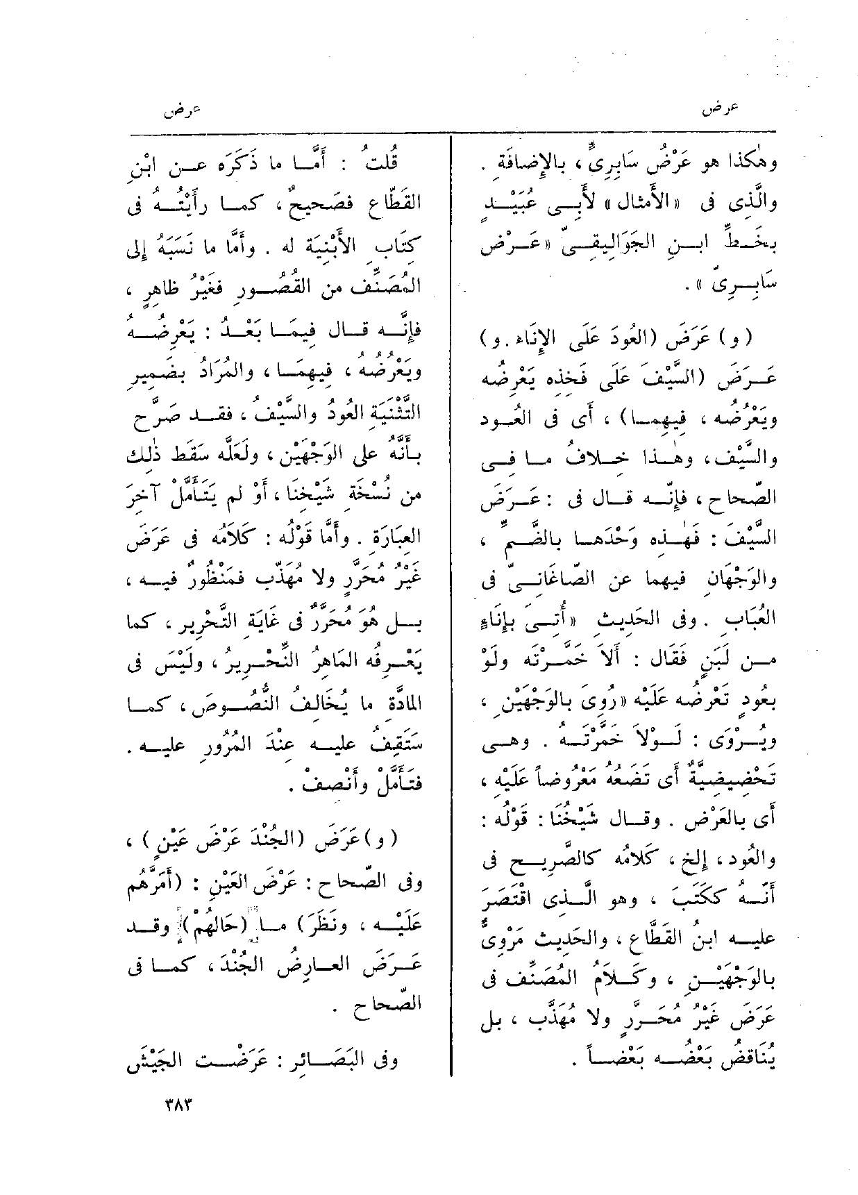 والَّذِي فِي الأَمثال لأَبِي عُبَيْدٍ بخَطِّ ابنِ الجَوَالِيقِيّ عَرْض سَابِرِيّ. عَرَضَ العُودَ عَلَى الإِنَاء. وعَرَضَ السَّيْفَ عَلَى فَخِذِه يَعْرِضُه ويَعْرُضُه، فِيهِما، أَي فِي العُود والسَّيْف، وَهَذَا خِلافُ مَا فِي الصّحاح، فإِنّه قَالَ فِي: عَرَضَ السَّيْفَ: فهذِه وَحْدَها بالضَّمِّ، والوَجْهَانِ فيهمَا عَن الصَّاغَانِيّ فِي العُبَابِ. وَفِي الحَدِيثِ أُتِيَ بإِنَاءٍ من لَبَنٍ فَقَال: أَلاَ خَمَّرْتَه ولَوْ بعُودٍ تَعْرِضُه عَلَيْه رُوِيَ بالوَجْهَيْنِ، ويُرْوَى: لَوْلاَ خَمَّرْتَهُ. وَهِي تَحْضِيضِيَّةٌ أَي تَضَعُهُ مَعْرُوضاً عَلَيْهِ، أَي بالعَرْض.