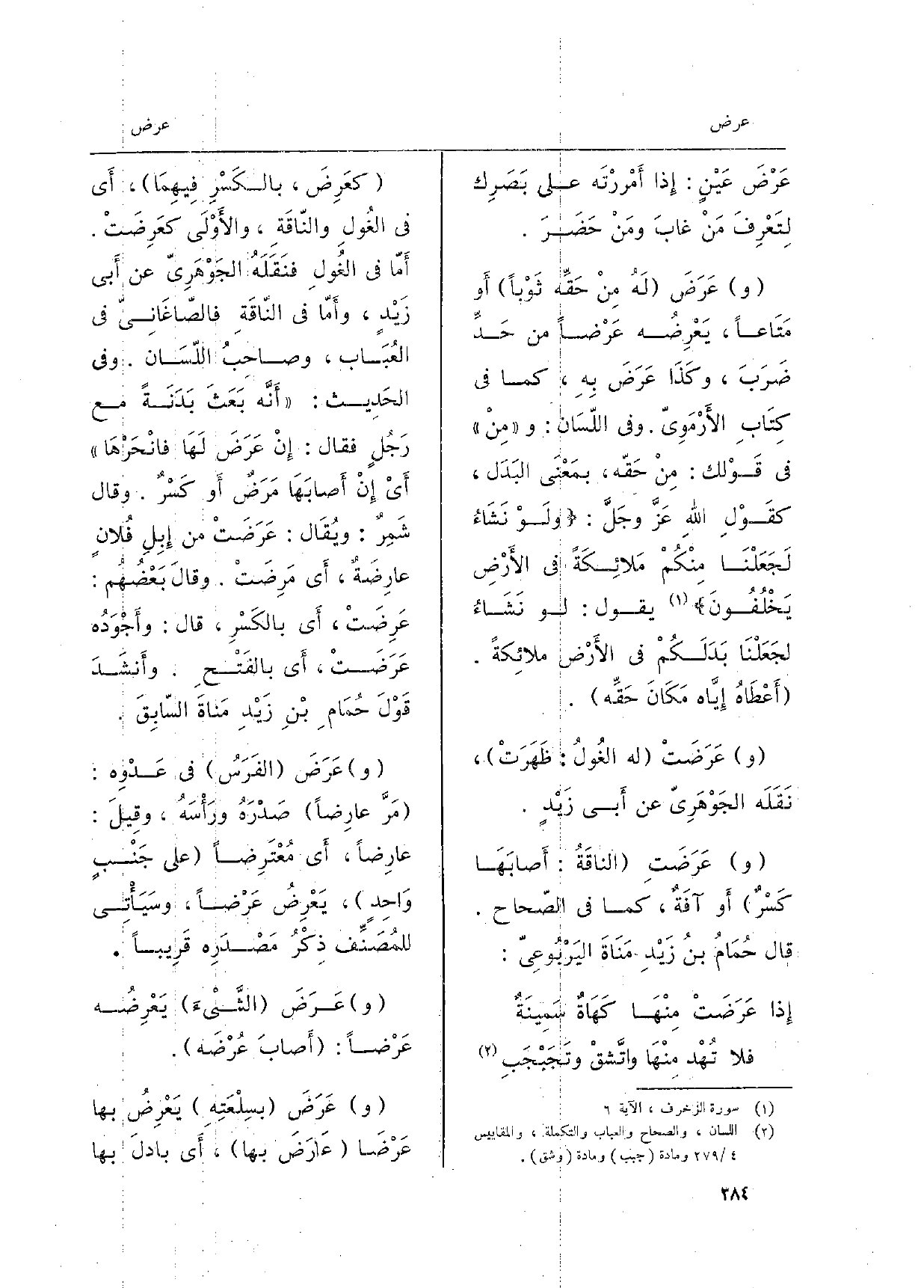 على بَصَرِك لِتَعْرِفَ مَنْ غابَ ومَنْ حَضَرَ. عَرَضَ لَهُ مِنْ حَقِّه ثَوْباً أَو مَتَاعاً، يَعْرِضُه عَرْضاً من حَدِّ ضَرَبَ، وكَذَا عَرَضَ بِهِ، كَمَا فِي كِتَابِ الأَرْمَوِيّ. وَفِي اللّسَان: ومِنْ فِي قَوْلك: مِنْ حَقّه، بمَعْنَى البَدَل، كقَوْلِ اللهِ عَزَّ وجَلَّ: ولَوْ نَشَاءُ لَجَعَلْنَا مِنْكُمْ مَلائِكَةً فِي الأَرْضِ يَخْلُفُونَ يَقُول: لَو نَشَاءُ لجَعَلْنَا بَدَلَكُمْ فِي الأَرْض ملائِكَةً. أَعْطَاهُ إِيَّاه مَكَانَ حَقِّه. عَرَضَتْ لَهُ الغُولُ: ظَهَرَتْ، نَقَلَه الجَوْهَرِيّ عَن أَبي زَيْدٍ. عَرَضَتِ الناقَةُ: أَصابَهَا كَسْرٌ أَو آفَةٌ، كَمَا فِي الصّحاح. وَقَالَ حُمَامُ بنُ زَيْدِ مَنَاةَ اليَرْبُوعِيّ: