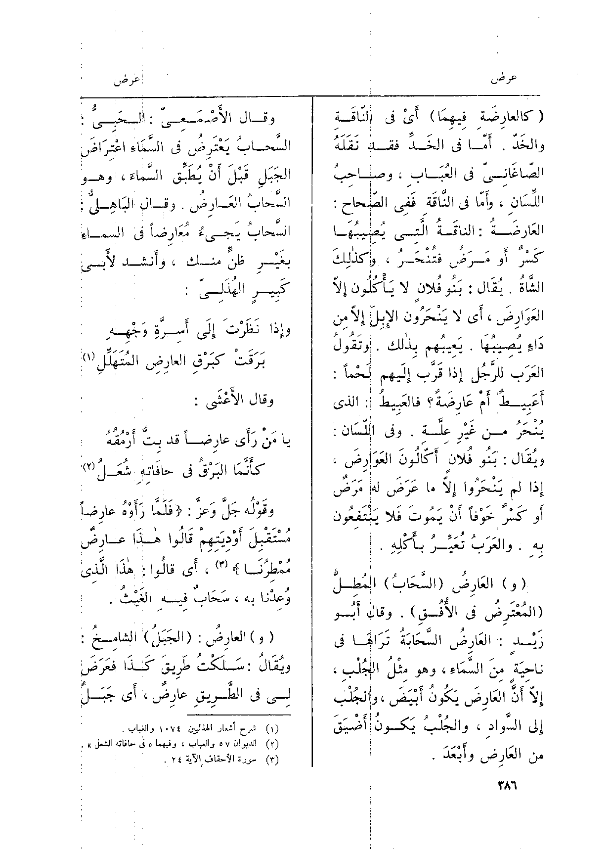 وقَوْلُه جَلَّ وَعزَّ: فَلَمَّا رَأَوْهُ عارِضاً مُسْتَقْبِلَ أَوْدِيَتهِمْ قَالُوا هذَا عارِضٌ مُمْطِرُنَا، أَي قالُوا: هذَا الَّذِي وَعِدْنا بِهِ، سَحَابٌ فِيهِ الغَيْثُ. العارِضُ: الجَبَلُ الشامِخُ: ويُقَالُ: سَلَكْتُ طَرِيقَ كَذَا فَعَرَضَ لِي فِي الطَّرِيقِ عارِضٌ، أَي جَبَل