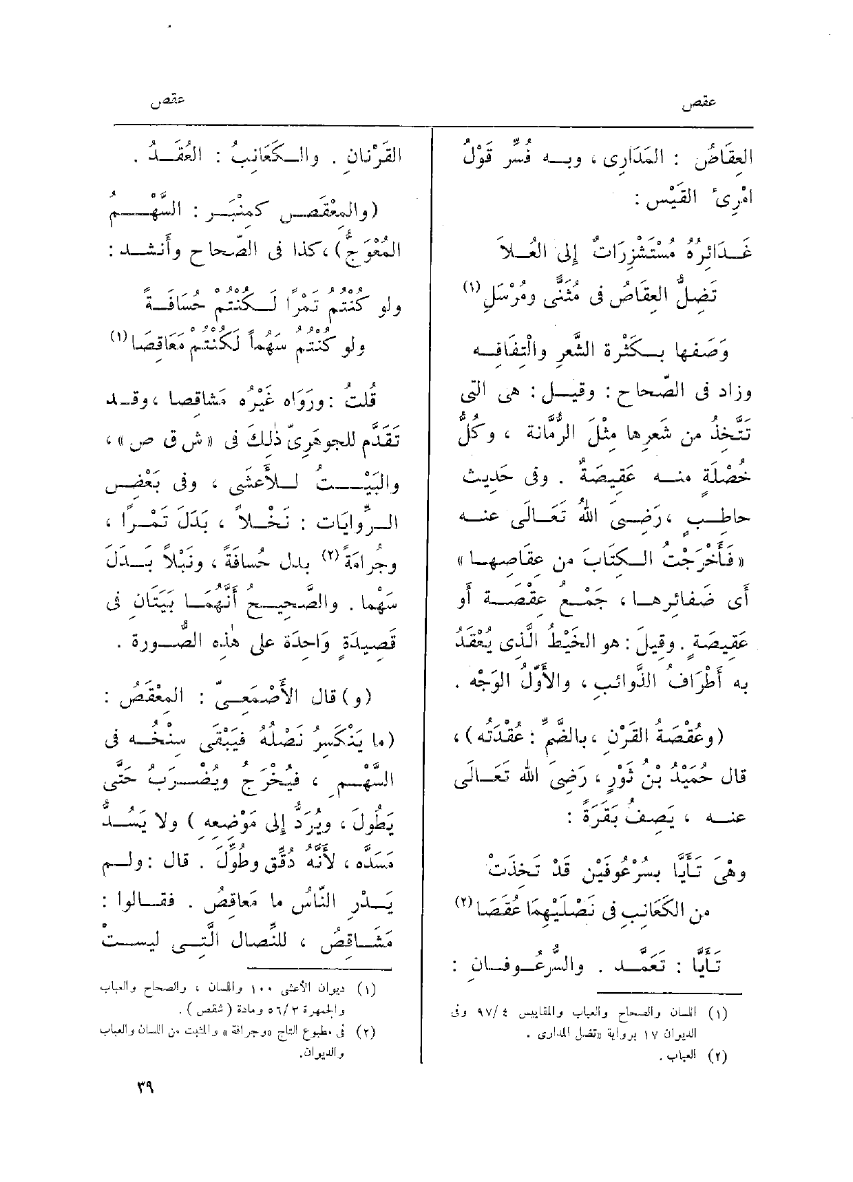 قُلتُ: ورَوَاه غَيْرُه مَشاقِصَا، وَقد تَقَدَّم للجوهَرِيّ ذلِكَ فِي ش ق ص، والبَيْتُ للأَعشَى، وَفِي بَعْضِ الرِّوايَات: نَخْلاً، بَدَلَ تَمْراً، وجُرامَةً بدل حُسافَةً، ونَبْلاً بَدَلَ سَهْماً. والصَّحِيحُ أَنَّهُمَا بَيَتَانِ فِي قَصِيدَةٍ وَاحِدَة على هذِه الصُّورة. قَالَ الأَصْمَعِيّ: المِعْقَصُ: مَا يَنْكَسِرُ نَصْلُهُ فيَبْقَى سِنْخُه فِي السَّهْمِ، فيُخْرَجُ ويُضْرَبُ حَتَّى يَطُولَ، ويُرَدُّ إِلى مَوْضِعِهِ وَلَا يَسُدُّ مَسَدَّه، لأَنُّهُ دُقِّق وطُوِّلَ.