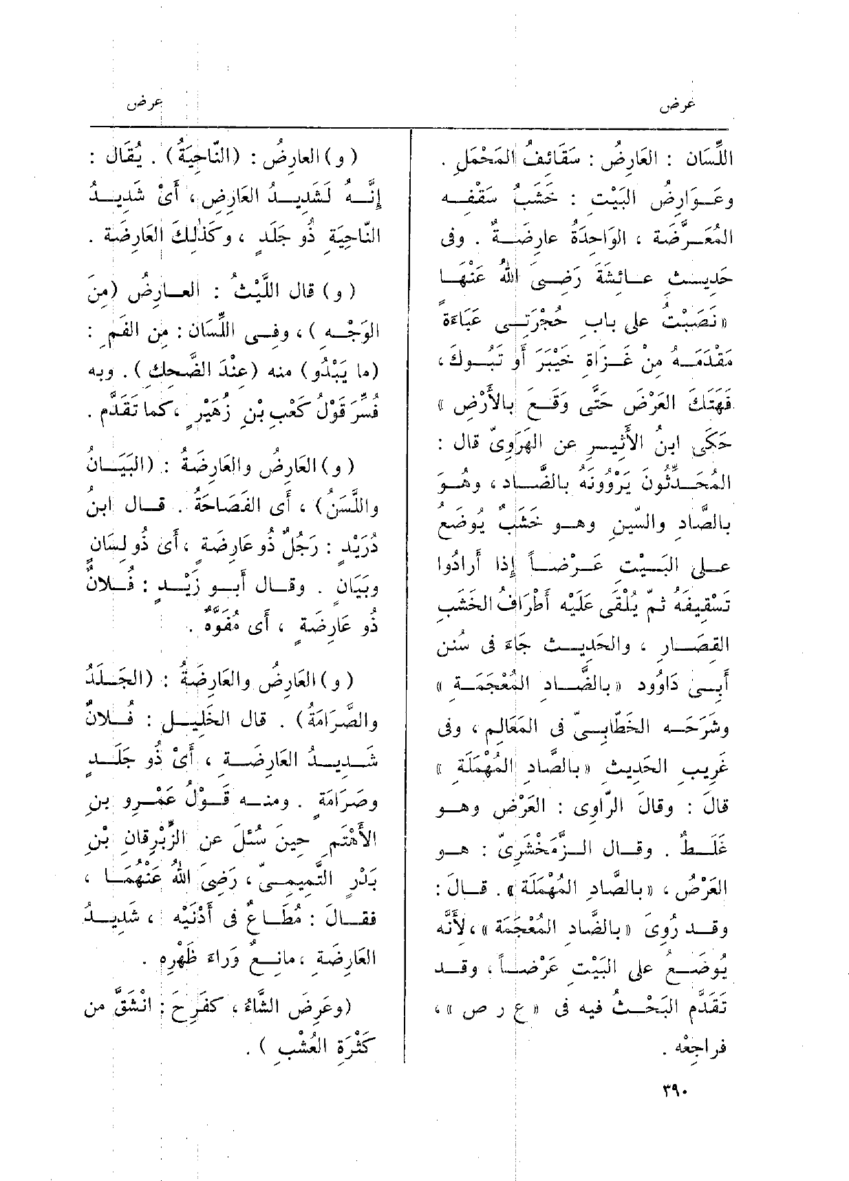 اللِّسَان: العَارِضُ: سَقَائِفُ المَحْمَلِ. وعَوَارِضُ البَيْتِ: خَشَبُ سَقْفِه المُعَرَّضَة، الوَاحِدَةُ عارِضَةٌ. وَفِي حَدِيثِ عائِشَةَ رَضِيَ اللهُ عَنْهَا نَصَبْتُ على بابِ حُجْرَتِي عَبَاءَةً مُقْدَمَةُ مِنْ غَزَاةِ خَيْبَرَ أَو تَبُوكَ، فَهَتَكَ العَرْضَ حَتَّى وَقَعَ بالأَرْضِ حَكَى ابنُ الأَثِيرِ عَن الهَرَوِيّ قَالَ: المُحَدِّثُونَ يَرْوُونَهُ بالضَّاد، وهُوَ بالصَّادِ والسّينِ وَهُوَ خَشَبٌ يُوضَعُ على البَيْتِ عَرْضاً إِذا أرادُوا تَسْقِيفَهُ ثمّ يُلْقَى عَلَيْه أطْرَافُ الخَشَبِ القِصَارِ، والحَدِيث جَاءَ ف سُنن أَبِي دَاوُود بالضَّادِ المُعْجَمَةِ وشَرَحَه الخَطّابِيّ فِي المَعَالِم، وَفِي غَرِيبِ الحَدِيثِ بالصَّادِ المُهْمَلَةِ قالَ: وقالَ الرَّاوِي: العَرْض وَهُوَ غَلَطٌ. وَقَالَ الزَّمَخْشَرِيّ: هُوَ العَرْضُ، بالصَّادِ)