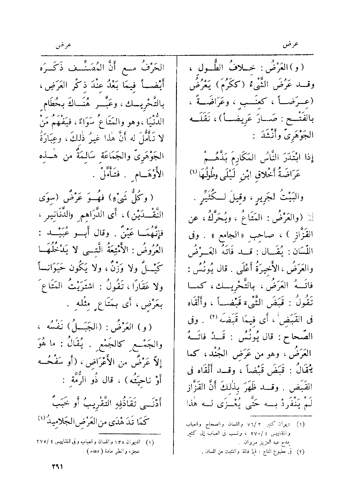 والبَيْتُ لجَرِيرٍ، وقِيلَ لكُثَيِّرٍ. والعَرْضُ: المَتَاعُ، ويُحَرَّكُ، عَن القَزَّاز، صاحِبِ الْجَامِع. وَفِي اللّسَان: يُقَال: قد فَاتَهُ العَرْضُ والعَرَضُ، الأَخِيرَةُ أَعْلَى. قَالَ يُونُسُ: فاتَهُ العَرَضُ، بالتَّحْرِيك، كَمَا تَقُولُ: قَبَضَ الشَّيْءَ قَبْضاً، وأَلْقَاه فِي القَبَضِ، أَي فِيمَا قَبَضَه. وَفِي الصّحاح: قَالَ يُونُسُ: قَدْ فاتَهُ العَرَضُ، وَهُوَ من عَرَضِ الجُنْد، كَمَا يُقَالُ: قَبَضَ قَبْضاً، وَقد أَلْقَاه فِي القَبَض. وَقد ظَهَرَ بِذلِكَ أَنَّ القَزَّاز لَمْ يَنْفَردْ بِهِ حَتَّى يُعْزَى لَهُ هَذَا الحَرْفُ مَعَ أَنَّ المُصَنِّف ذَكَرَه أَيْضاً فِيمَا بَعْدُ عِنْدَ ذِكْر العَرَضِ، بالتَّحْرِيك، وعَبَّر هُنَاكَ بحُطَامِ الدُّنْيَا، وَهُوَ والمَتَاعُ سَوَاءٌ، فيَفْهَمُ مَنْ لَا تَأَمُّلَ لَهُ أَنَّ هَذَا غيرُ ذلِكَ، وعِبَارَةُ الجَوْهَرِيّ والجَمَاعَةِ سَالِمَةٌ من هذِه الأَوْهَامِ. فتَأَمَّلْ. وكُلُّ شَيْءٍ فهُوَ عَرْضٌ سِوَى النَّقْدَيْن، أَي الدَّرَاهِمِ والدَّنَانِيرِ فإِنَّهُمَا عَيْنٌ. وَقَالَ أَبو عُبَيْد: العُرُوضُ: الأَمْتِعَةُ الَّتِي لَا يَدْخُلُهَا كَيْلٌ وَلَا وَزْنٌ، وَلَا يَكُون حَيَوَاناً وَلَا عَقَاراً، تَقُولُ: اشتَرَيْتُ المَتَاعَ بعَرْضٍ، أَي بمَتَاعٍ مِثْلهِ. العَرْضُ: الجَبَلُ نَفْسُه، والجَمْعِ كالجَمْعِ. يُقَالُ: مَا هُوَ إِلاّ عَرْضٌ من الأَعْرَاضِ، أَو سَفْحُه أَوْ ناحِيَتُه، قَالَ ذُو الرُّمَّةِ: