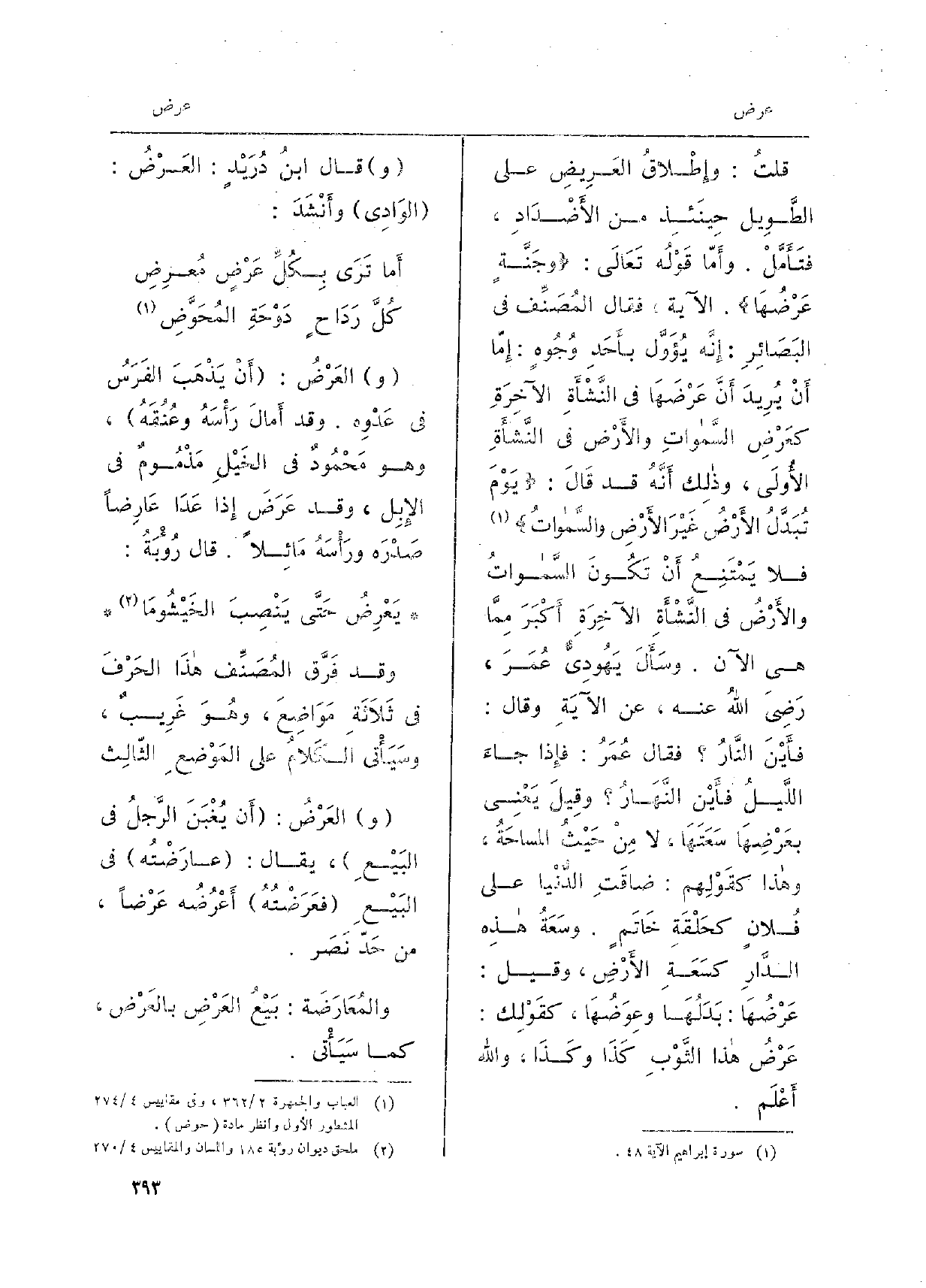 الْآيَة، فَقَالَ المُصَنِّف فِي البَصَائِرِ: إِنَّه يُؤَوَّل بأَحَدِ وُجُوهٍ: إِمَّا أَنْ يُرِيدَ أَنَّ عَرْضَهَا فِي النَّشْأَةِ الآخِرَةِ كعَرْضِ السَّمواتِ والأَرْض فِي النَّشأَةِ الأُولَى، وذلِك أَنَّهُ قد قَالَ: يَوْمَ تُبَدَّلُ الأَرْضُ غَيْرَ الأَرْضِ والسَّمواتُ فَلَا يَمْتَنِعُ أَنْ تَكُون السَّمواتُ والأَرْضُ فِي النَّشْأَةِ الآخِرَةِ أَكْبَرَ مِمَّا هِيَ الْآن. وسَأَلَ يَهُودِيٌّ عُمَرَ، رَضِيَ اللهُ عَنهُ، عَن الآيَةِ وَقَالَ: فأَيْنَ النَّارُ فَقَالَ عُمَرُ: فإِذا جاءَ اللَّيِلُ فأَيْن النَّهَارُ وقِيلَ يَعْنِي بعَرْضِهَا سَعَتَهَا، لَا مِنْ حَيْثُ المساحَةُ، وَهَذَا كقَوْلِهم: ضاقَتِ الدُّنْيَا على فُلانٍ كحَلْقَةِ خَاتَمٍ. وسَعَةُ هذِه الدَّارِ كسَعَةِ الأَرْضِ، وَقيل: عَرْضُهَا: بَدَلُهَا وعِوَضُهَا، كقَولِك: عَرْضُ هَذَا الثَّوْبِ كَذَا وكَذَا، وَالله أَعْلَم. قَالَ ابنُ دُرَيْدٍ: العَرْضُ: الوَادِي وأَنْشَدَ: أَما تَرَى بِكُلِّ عَرضٍ مُعرِضِ كُلَّ رَدَاحٍ دَوْحَةِ المُحَوَّضِ العَرْضُ: أَنْ يَذْهَبَ الفَرَسُ فِي عَدْوِه. وَقد أَمالَ رَأْسَهُ وعُنُقَهُ، وَهُوَ مَحْمُودٌ فِي الخَيْلِ مَذْمُومٌ فِي الإِبِل، وَقد عَرَضَ إِذا عَدَا عَارِضاً صَدْرَه ورَأْسَهُ مَائِلاً. قَالَ رُؤْبَةُ: يَعْرِضُ حَتَّى يَنْصِلَ الخَيْشُومَا)