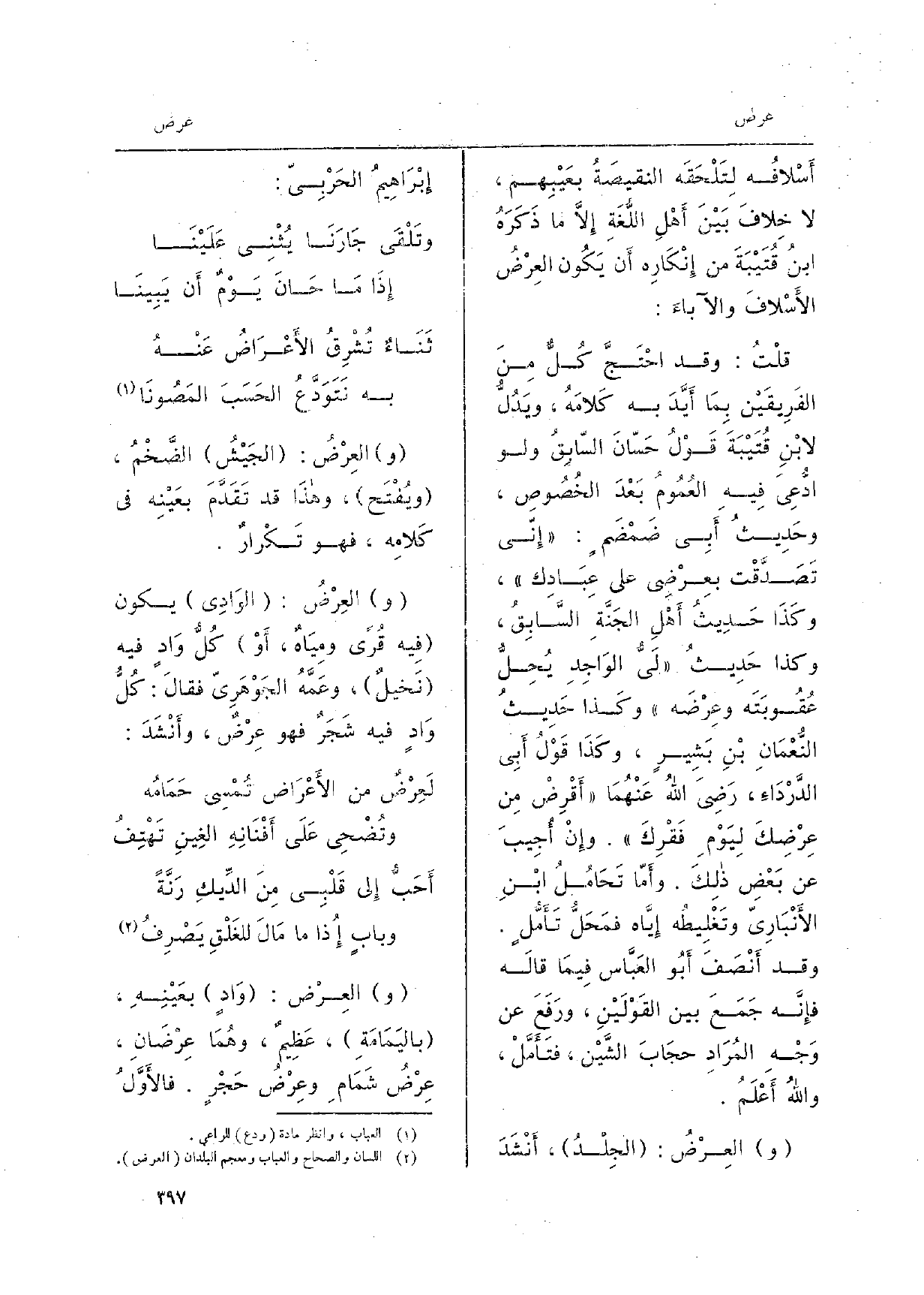 أَسْلافَه لِتَلْحَقَه النقيصَةُ بعَيْبِهم، لَا خِلافَ بَيْنَ أَهْلِ اللّغَةِ إِلاَّ مَا ذَكَرَهُ ابنُ قُتَيْبَةَ من إِنْكَارِه أَن يَكُون العِرْضُ الأَسْلافَ والآباءَ: قلْتُ: وَقد احْتَجَّ) كُلٌّ مِنَ الفَرِيقَيْن بِمَا أَيَّدَ بِهِ كَلامَهُ، ويَدُلُّ لابْنِ قُتَيْبَةَ قَوْلُ حَسّانَ السّابِقُ وَلَو ادُّعِيَ فِيهِ العُمُومُ بَعْدَ الخُصُوصِ، وحَدِيثُ أَبِي ضَمْضَمٍ: إِنّي تَصَدَّقْت بعِرْضِي على عِبَادِك، وكَذَا حَدِيثُ أَهْلِ الجَنَّةِ السَّابِقُ، وَكَذَا حَدِيثُ لَيُّ الوَاجِدِ يُحِلُّ عُقُوبَتَه وعِرْضَه وكَذا حَدِيثُ النُّعْمَانِ بْنِ بَشِيرٍ، وكَذَا قَوْلُ أَبِي الدَّرْدَاءِ، رَضِيَ اللهُ عَنْهُمَا أَقْرِضْ مِن عِرْضِكَ لِيَوْمِ فَقْرِكَ. وإِنْ أُجِيبَ عَن بَعْضِ ذلِكَ. وأَمّا تَحَامُلُ ابْنِ الأَنْبَارِيّ وتَغْلِيظُه إِيَّاه فمَحَلُّ تَأَمُّلٍ. وَقد أَنْصَفَ أَبُو العَبَّاسِ فِيمَا قالَه فإِنَّه جَمَعَ بَين القَوْلَيْنِ، ورَفَعَ عَن وَجْهِ المُرَادِ حِجَابَ الشَّيْن، فتَأَمَّلْ، واللهُ أَعْلَمُ. العِرْضُ: الجِلْدُ، أَنْشَدَ إِبْرَاهِيمُ الحَرْبِيّ: