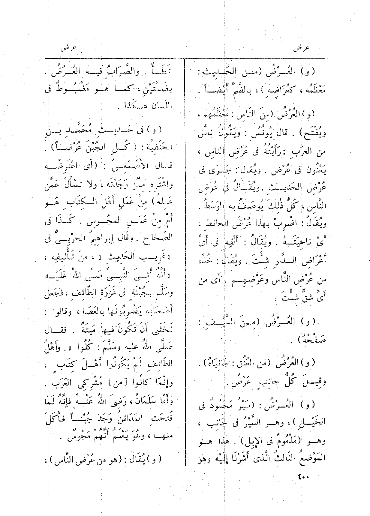 قَالَ يُونُسُ: ويَقُولُ ناسٌ من العرَبِ: رَأَيْتُهُ فِي عَرْضِ الناسِ، يَعْنُون فِي عُرْض. ويُقَال: جَرَى فِي عُرْضِ الحَديثِ. ويُقَالُ فِي عُرْضِ النَّاسِ، كُلُّ ذلِكَ يُوصَفُ بِهِ الوَسَطُ. ويُقَالُ: اضْرِبْ بِهَذَا عُرْضَ الحائطِ، أَيْ ناحِيَتَهُ. ويُقَال: أَلْقِهِ فِي أَيِّ أَعْرَاضِ الدَّارِ شِئْتَ. ويُقَال: خُذْه من عُرْضِ النَّاسِ وعَرْضِهِم. أَي من أَيِّ شِقٍّ شِئْتَ. العُرْضُ مِنَ السَّيْفِ: صَفْحُهُ. العُرْضُ من العُنُق:) جَانِبَاهُ. وقِيلَ كُلُّ جانِبٍ عُرْضٌ. العُرْضُ: سَيْرٌ مَحْمُودٌ فِي الخَيْلِ، وَهُوَ السَّيْرُ فِي جَانِبٍ، وَهُوَ مَذْمُومٌ فِي الإِبِل. هَذَا هُوَ المَوْضِعُ الثّالثُ الَّذِي أَشَرْنَا إِلَيْه وَهُوَ خَطَأٌ. والصَّوَابُ فِيهِ العُرُضُ، بضَمَّتَيْنِ، كَمَا هُوَ مَضْبُوطٌ فِي اللّسان هكَذا. فِي حَدِيثِ مُحَمَّدِ بنِ الحَنَفِيَّة: كُلِ الجُبْنَ عُرْضاً. قَالَ الأَصْمَعِيّ: أَي اعْتَرِضْه واشْتَرِهِ مِمَّن وَجَدْتَه، وَلَا تَسْأَلْ عَمَّن عَمِلهُ مِنَ عَمَلِ أَهْلِ الكِتَابِ هُو أَمْ مِنْ عَمَلِ المجُوسِ. كَذَا فِي الصّحاح. وقَال إِبراهِيمُ الحرْبِيُّ فِي غَرِيب الحَدِيثِ، مِنْ تَأْلِيفِه، أَنَّهُ أُتِيَ النَّبِيُّ صَلَّى اللهُ عَلَيْه وسَلَّم بجُبْنَةٍ فِي غَزْوَةِ الطّائِفِ، فجَعل أَصْحَابُه يَضْرِبُونَها بالعَصَا، وَقَالُوا: نَخْشَى أَنْ تَكُونَ فِيهَا مَيتَةٌ. فَقَالَ صَلَّى اللهُ عَلَيْهِ وسَلَّمً: كُلُوا. وأَهْلُ الطّائِفِ لَمْ يَكُونُوا أَهْلَ كِتَابٍ، وإِنَّمَا كانُوا من مُشْرِكِي العَرَب. وأَمّا سَلْمَانُ، رَضِيَ اللهُ عَنْهُ فإِنَّهُ لَمّا فُتِحَتِ المَدَائنُ وَجَدَ جُبْناً فأَكَلَ مِنْهَا، وهُوَ يَعْلَمُ أَنَّهُمْ مَجُوسٌ. يُقَال: هُوَ من عُرْض النَّاسِ،