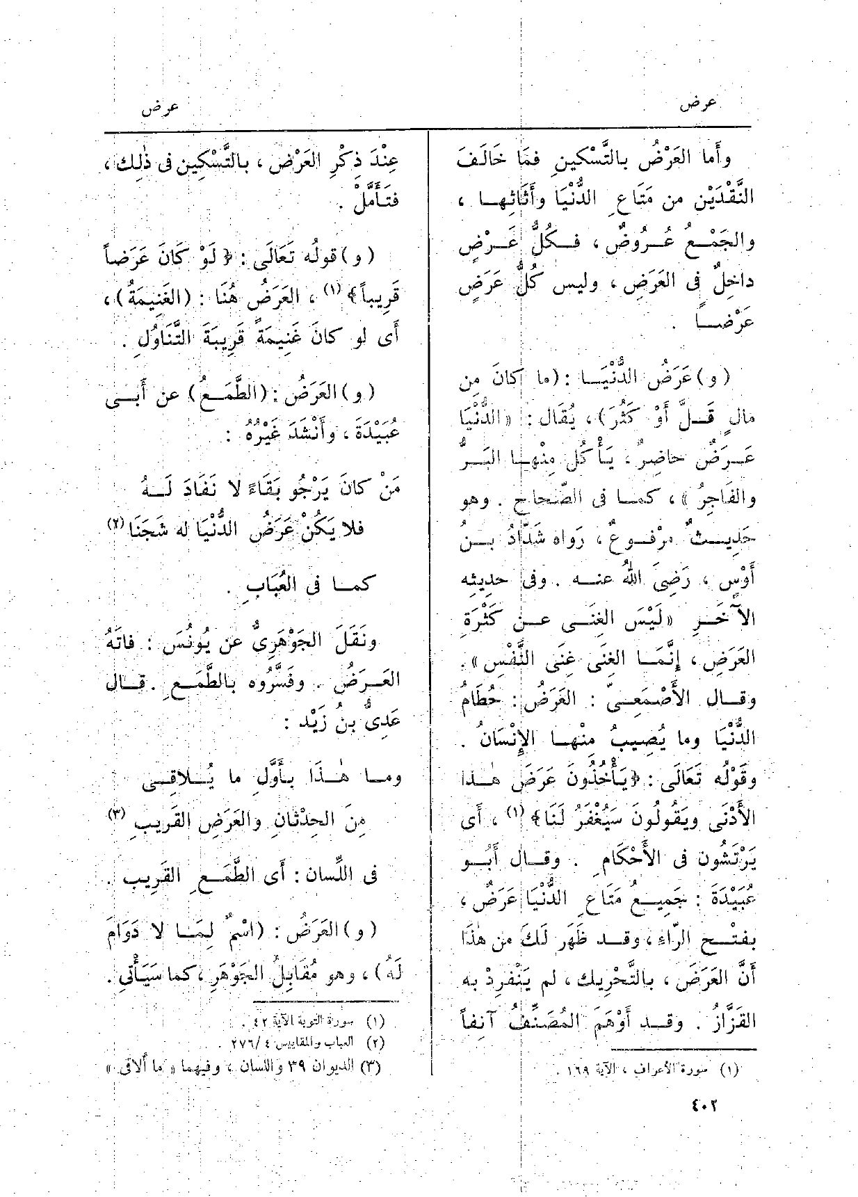 وأَثَاثِها، والجَمْعُ عُرُوضٌ، فكُلُّ عَرْضٍ داخِلٌ فِي العَرَضِ، وَلَيْسَ كُلُّ عَرَضٍ عَرْضاً. عَرَضُ الدُّنْيَا: مَا كانَ مِن مالٍ قَلَّ أَوْ كَثُرَ، يُقَال: الدُّنْيَا عَرَضٌ حاضِرٌ، يَأْكُل مِنْهما البَرُّ والفَاجِرُ، كَمَا فِي الصّحاح. وَهُوَ حَدِيثٌ مَرْفُوعٌ، رَواه شَدّادُ بنُ أَوْسٍ، رَضِيَ اللهُ عَنهُ. وَفِي حَدِيثِه الآَخرِ لَيْسَ الغِنَى عَن كَثْرَةِ العَرَضِ، وإِنَّمَا الغِنَى غِنَى النَّفْسِ. وقَوْلُه تَعَالَى: يَأْخُذُونَ عَرَضَ هَذَا الأَدْنَى ويَقُولُونَ سَيُغْفَرُ لَنَا، أَي يَرْتَشُون فِي الأَحْكَامِ. وَقَالَ أَبُو عُبَيْدَةَ: جَمِيعُ مَتَاعِ الدُّنْيَا عَرَضٌ، بفتْح الرّاءِ، وَقد ظَهَر لَكَ من هذَا أَنَّ العَرَضَ، بالتَّحْرِيك، لم يَنْفرِدْ بِهِ القَزَّازُ. وَقد أَوْهَمَ المُصَنِّفُ آنِفاً عِنْدَ ذِكْرِ العَرْض، بالتَّسْكِين فِي ذلِك، فتَأَمَّلْ. قولُه تَعَالَى: لَوْ كَانَ عَرَضاً قَرِيباً، العَرَضُ هُنَا: الغَنِيمَةُ، أَي لَو كانَ غَنِيمَةً قَرِيبَةَ التَّنَاوُلِ. العَرَضُ: الطَّمَعُ عَن أَبي عُبَيْدَةَ، وأَنْشَدَ غَيْرُهُ: