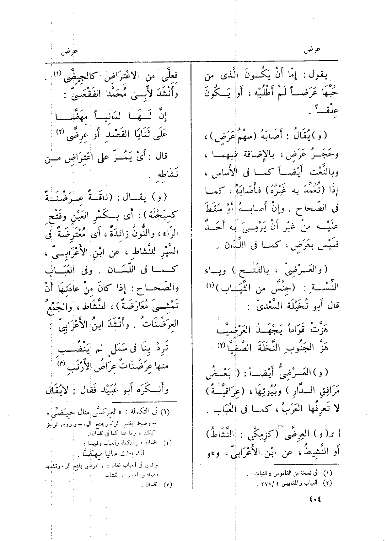 يَقُول: إِمّا أَنْ يَكُونَ الَّذِي من حُبِّهَا عَرَضاً لَمْ أَطْلُبْه، أَو يَكُونَ عِلْقاً. يُقَالُ: أَصَابَهُ سهْمُ عَرَضٍ، وحَجَرُ عَرَضٍ، بالإِضافَة فيهمَا، وبالنَّعْت أَيْضاً كَمَا فِي الأساس، إِذَا تُعُمِّدَ بِهِ غَيْرُهُ فأَصَابَهُ، كَمَا فِي الصّحاح. وإِنْ أَصابهُ أَوْ سَقَطَ عَلَيْه منْ غيْر أَنْ يَرْمِيَ بِهِ أَحَدٌ فلَيْس بعَرَضٍ، كَمَا فِي اللِّسَان. والعَرْضِيّ، بالفَتْح وياءِ النِّسْبةِ: جِنْسٌ من الثِّيَاب قَالَ أَبو نُخَيْلَة السَّعْديّ: هَزَّتْ قَوَاماً يَجْهَدُ العَرْضِيَّا هَزَّ الجَنُوبِ النَّخْلَةَ الصَّفِيَّا العَرْضِيُّ أَيْضاً: بَعْضُ مَرَافِقِ الدَّارِ وبُيُوتِهَا، عِرَاقيَّةٌ لَا تَعرِفُها العَرَبُ، كَمَا فِي العُبَاب.