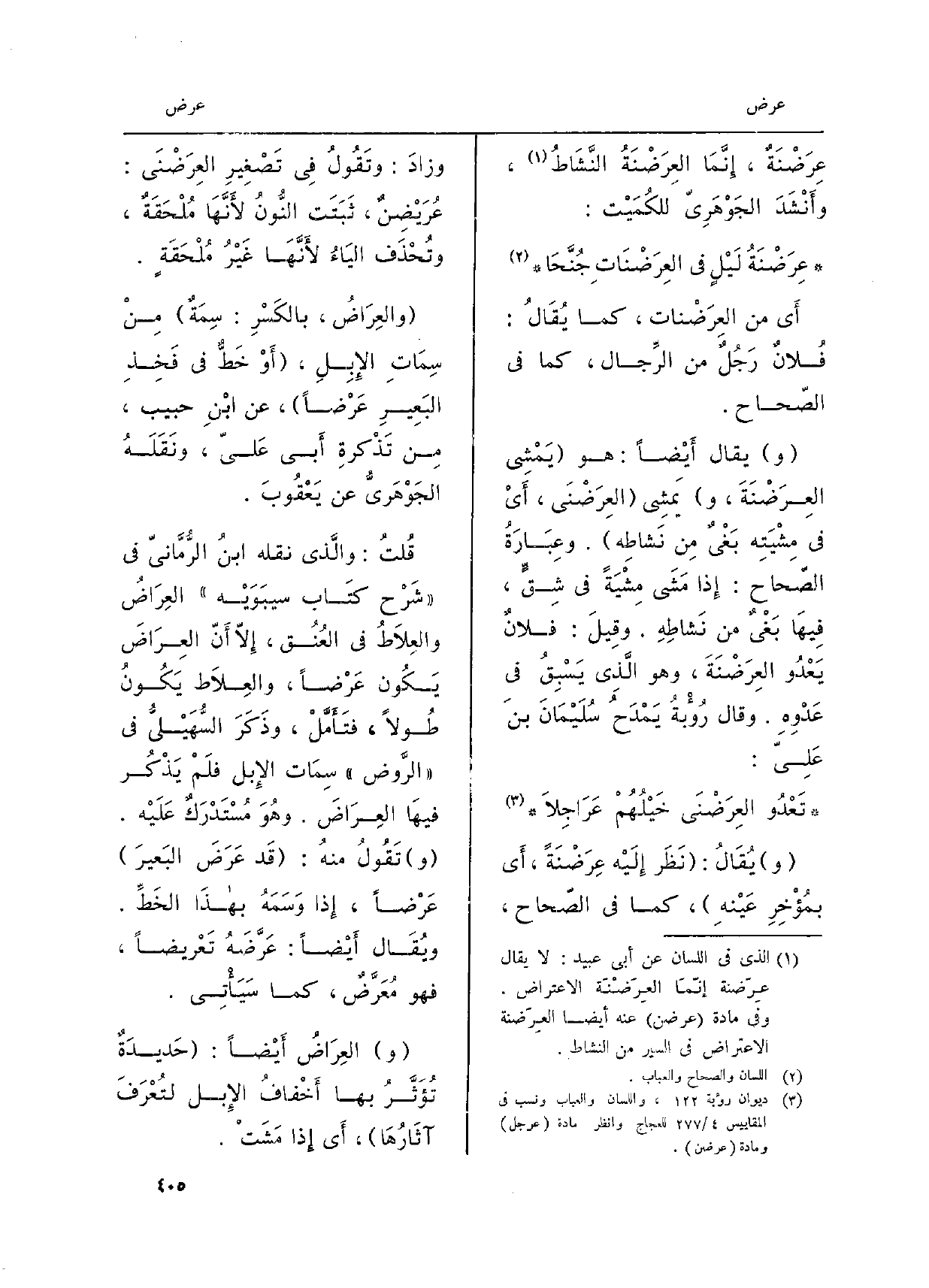 عِرَضْنَةٌ، إِنَّمَا العِرَضْنَةُ النَّشَاطُ، وأَنْشَدَ الجَوْهَرِيّ للكُمَيْت: عِرَضْنَةُ لَيْلٍ فِي العِرَضْنَاتِ جُنَّحَا أَي من العِرَضْنات، كَمَا يُقَالُ: فُلانٌ رَجُلٌ من الرِّجال، كَمَا فِي الصّحاح. يُقَال أَيْضاً: هُوَ يَمْشِي العِرَضْنَةَ، ويمشِي العِرَضْنَى، أَيْ فِي مِشْيَتِه بَغْيٌ مِن نَشاطِه. وعِبَارَةُ الصّحاح: إِذا) مَشَى مِشْيَةً فِي شِقٍّ، فِيهَا بَغْيٌ من نَشاطِهِ. وقِيلَ: فلانٌ يَعْدُوا العِرَضْنَةَ، وَهُوَ الَّذِي يَسْبِقُ فِي عَدْوِهِ. وَقَالَ رُؤْبةُ يَمْدَحُ سُلَيْمَانَ بنَ عَلِيّ: تَعْدُو العِرَضْنَى خَيْلُهُمْ عَرَاجِلاَ يُقَالُ: نَظَر إِلَيْه عِرَضْنَةً، أَي بمُؤْخِرِ عَيْنهِ، كَمَا فِي الصّحاح، وزادَ: وتَقُولُ فِي تَصْغِيرِ العِرَضْنَى: عُرَيْضِنٌ، ثَبَتَت النُّونُ لأَنَّهَا مُلْحَقَةٌ، وتُحْذَف اليَاءُ لأَنَّهَا غَيْرُ مُلْحَقَةٍ. والعِرَاضُ، بالكَسْرِ: سِمَةٌ مِنْ سِمَاتِ الإِبِلِ، أَوْ خَطٌّ فِي فَخِذِ البَعِيرِ عَرْضاً، عَن ابْنِ حبيب، مِن تَذْكرةِ أَبي عَليّ، ونَقَلَهُ الجَوْهَريُّ عَن يَعْقُوبَ. قُلتُ: والَّذي نَقله ابنُ الرُّمَّانيّ فِي شَرْح كتَاب سَيبَوَيْه العِرَاضُ والعِلاَطُ فِي العُنُق، إِلاّ أَنّ العِرَاضَ يَكُون عَرْضاً، والعِلاَط يَكُونُ طُولاً، فتَأَمَّلْ، وذَكَرَ السُّهَيْليُّ فِي الرَّوض سِمَاتِ الإِبل فلَمْ يَذْكُر فيهَا العِرَاضَ. وهُوَ مُسْتَدْرَكٌ عَلَيْه. تَقُولُ منهُ: قَد عَرَضَ البَعيرَ عَرْضاً، إِذا وَسَمَهُ بهذَا الخَطِّ. ويُقَال أَيْضاً: عَرَّضَهُ تَعْرِيضاً، فَهُوَ مُعَرَّضٌ، كَمَا سَيَأْتِي. العِرَاضُ أَيْضاً: حَديدَةٌ تُؤَثَّرُ بهَا أَخْفافُ الإِبل لتُعْرَفَ آثَرُهَا، أَي إِذا مَشَتْ.