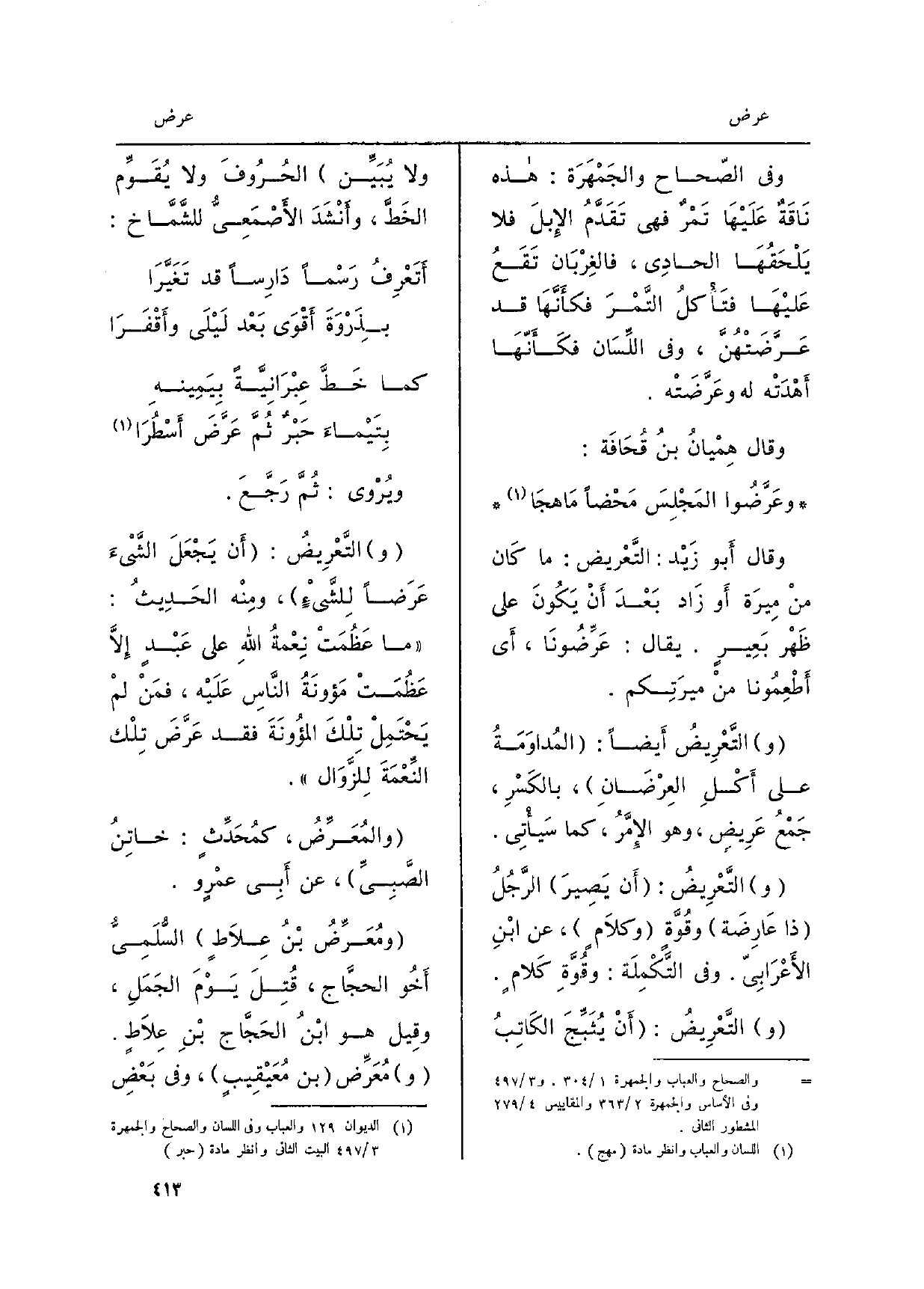 وعَرَّضُوا المَجْلِسَ مَحْضاً مَاهِجَا وَقَالَ أَبو زَيْد: التَّعْرِيض: مَا كَان منْ مِيرَة أَو زَاد بَعْدَ أَنْ يَكُونَ على ظَهْر بَعِيرٍ. يُقَال: عَرِّضُونَا، أَي أَطْعِمُونا منْ ميرَتِكم. التَّعْرِيضُ أَيضاً: المُداوَمَةُ على أَكْلِ العِرْضَانِ، بالكَسْرِ، جَمْعُ عَرِيضٍ، وَهُوَ الإِمَّرُ، كَمَا سَيأْتِي. التَّعْرِيضُ: أَن يَصِيرَ الرَّجُلُ ذَا عَارِضَة وقُوَّةٍ وكَلاَمٍ، عَن ابْنِ الأَعْرَابِيّ. وَفِي التَّكْمِلَة: وقُوَّةِ كَلامٍ. التَّعْرِيضُ: أَنْ يُثَبِّجَ الكَاتِبُ وَلَا يُبَيِّن الحُرُوفَ وَلَا يَقُوِّم الخَطَّ، وأَنْشَدَ الأَصْمَعِيُّ للشَّمَّاخ: