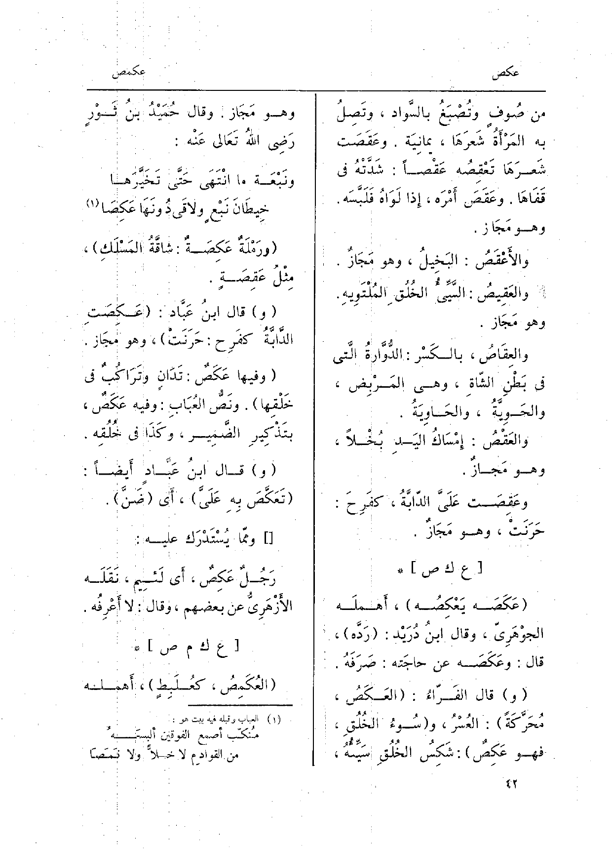 قَالَ الفَرّاءُ: العَكَصُ، مُحَرَّكَةً: العُسْرُ، وسُوءُ الخُلُقِ، فَهُوَ عَكِصٌ: شَكِسُ الخُلُقِ سَيِّئُهُ، وَهُوَ مَجَاز. وَقَالَ حُمَيْدُ بنُ ثَوْرٍ رَضِي اللهُ تَعَالى عَنْه: ونَبْعَة مَا انْتَهَى حَتَّى تَخَيَّرَها خِيطَانَ نَبْعٍ ولاقَى دُونَهَا عَكِصَا ورَمْلَةٌ عَكِصَةٌ: شاقَّةُ المُسْلَكِ، مِثْلُ عَقِصَةٍ. قَالَ ابنُ عَبَّاد: عَكِصَتِ الدَّابَّةُ كفَرِح: حَرَنَتْ، وَهُوَ مجَاز. وفيهَا عَكَصٌ: تَدَانٍ وتَرَاكُبٌ فِي خَلْقِها. ونَصُّ العُبَابِ: وَفِيه عَكَصٌ، بتّذْكِيرِ الضَّمير، وكَذَا فِي خُلُقِه. قَالَ ابنُ عَبَّادٍ أَيضاً: تَعَكَّصَ بِهِ عَلَيَّ، أَي ضَنَّ. وممّا يُسْتَدْرَك عَلَيْهِ: رَجُلٌ عَكِصٌ، أَي لَئِيم، نَقَلَه الأَزْهَرِيُّ عَن بَعضهم، وَقَالَ: لَا أَعْرِفُه.