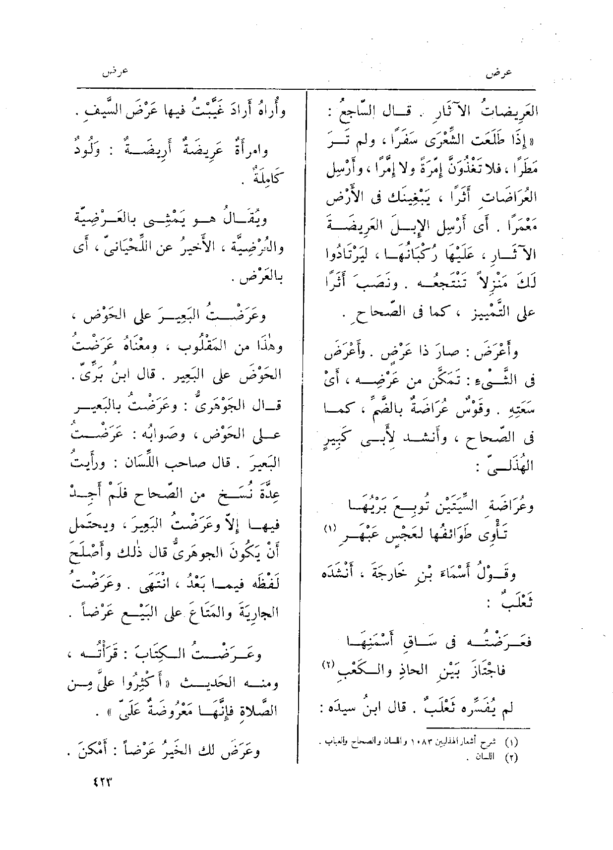 ُ العَرِيضاتُ الآثَارِ. قَالَ السّاجعُ: إِذَا طَلَعَت الشِّعْرَى سَفَراً، وَلم تَرَ مَطَراً، فَلَا تَغْدُوَنَّ إِمّرَةً وَلَا إِمَّراً، وأَرْسِل العُرَاضَاتِ أَثَراً، يَبْغِينَك فِي الأَرْض مَعْمَراً. أَي أَرْسِل الإِبلَ العَرِيضَةَ الآثَارِ، عَلَيْهَا رُكْبَانُهَا، ليَرْتَادُوا لَكَ مَنْزِلاً تَنْتَجعُه. ونَصَبَ أَثَراً على التَّمْييز، كَمَا فِي الصّحاحِ. وأَعْرَضَ: صارَ ذَا عَرْضٍ. وأَعْرَضَ فِي الشَّيْءِ: تَمَكَّن من عَرْضِه، أَيْ سَعَتِهِ. وقَوْسٌ عُرَاضَةٌ بالضَّمِّ، كَمَا فِي الصّحاح، وأَنشد لأَبِي كَبِيرٍ الهُذَليّ:
