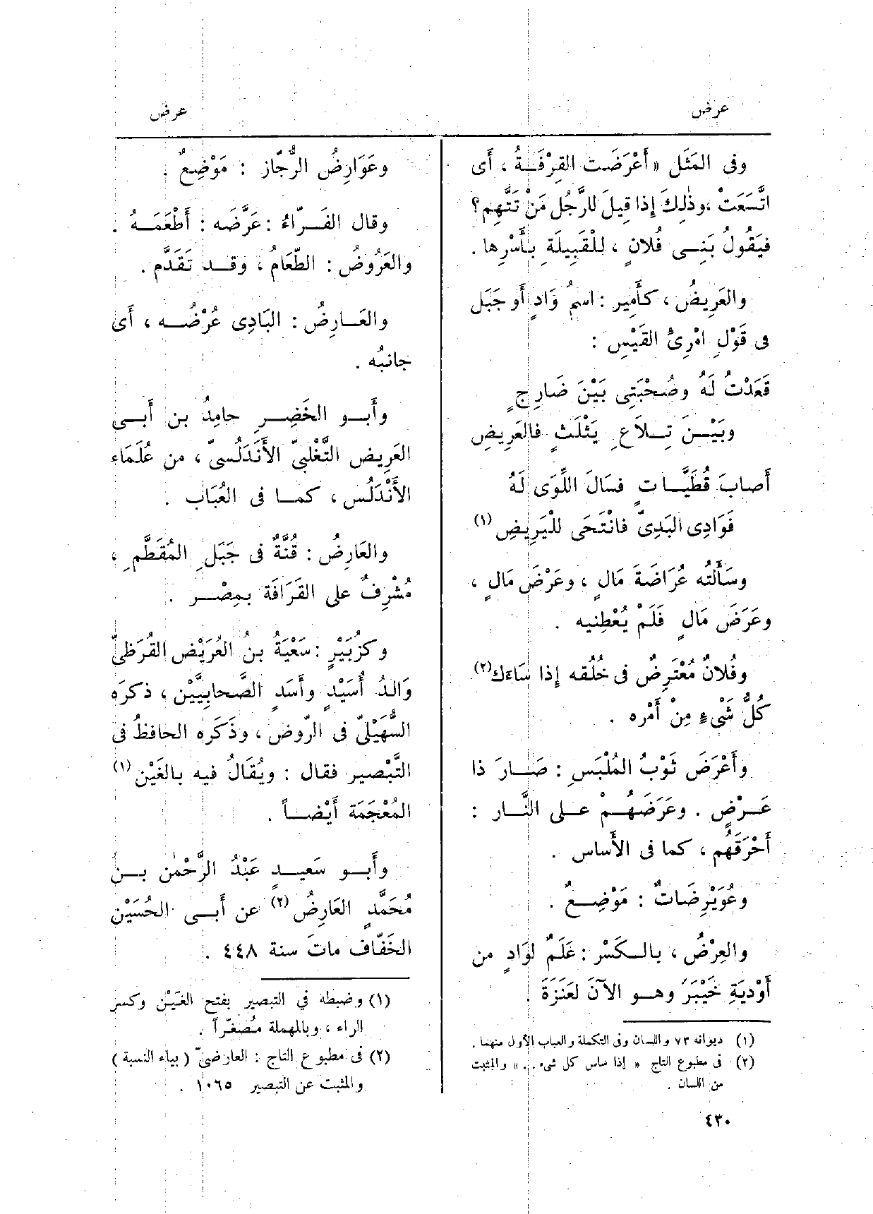 وسَأَلْتُه عُرَاضَةَ مَالٍ، وعَرْضَ مَالٍ، وعَرَضَ مَالٍ فَلَمْ يُعْطِنيه. وفُلانٌ مُعْتَرِضٌ فِي خُلُقه إِذا سَاءَك كُلُّ شَيْءٍ مِنْ أَمْره. وأَعْرَضَ ثَوْبُ المُلْبَسِ: صَارَ ذَا عَرْضٍ. وعَرَضَهُمْ على النَّار: أَحْرَقَهُم، كَمَا فِي الأَساس. وعُوَيْرِضَاتٌ: مَوْضِعٌ. والعِرْضُ، بالكَسْر: عَلَمٌ لوَادٍ من أَوْديَةِ خَيْبَرَ وَهُوَ الآنَ لعَنَزَةَ. وعَوَارِضُ الرُّجّاز: مَوْضِعٌ. وَقَالَ الفَرّاءُ: عَرَّضَه: أَطْعَمَهُ. والعَرُوضُ: الطّعامُ، وَقد تَقَدَّم. والعَارِضُ: البَادِي عُرْضُه، أَي جانبُه. وأَبو الخَضِرِ حامِدُ بن أَبي العَرِيض التَّغْلبيّ الأَنْدَلُسيّ، من عُلَمَاء الأَنْدَلُس، كَمَا فِي العُبَاب. والعَارِضُ: قُنَّةٌ فِي جَبَلِ المُقَطَّمِ، مُشْرِفٌ على القَرَافَة بمِصْر. وكزُبَيْرٍ: سَعْيَةُ بنُ العُرَيْض القُرَظيّ وَالدُ أُسَيْدٍ وأَسَدٍ الصَّحابِيَّيْن، ذكرَه السُّهَيْليّ فِي الرّوض، وذَكَره الحافظُ فِي التَّبْصير فَقَالَ: ويُقَالُ فِيهِ بالغَيْن المُعْجَمَة أَيْضاً. وأَبو سَعيدٍ عَبْدُ الرَّحْمن بن مُحَمَّدٍ العَارِضُ عَن أَبي الحُسَيْن الخَفّاف ماتَ سنة.