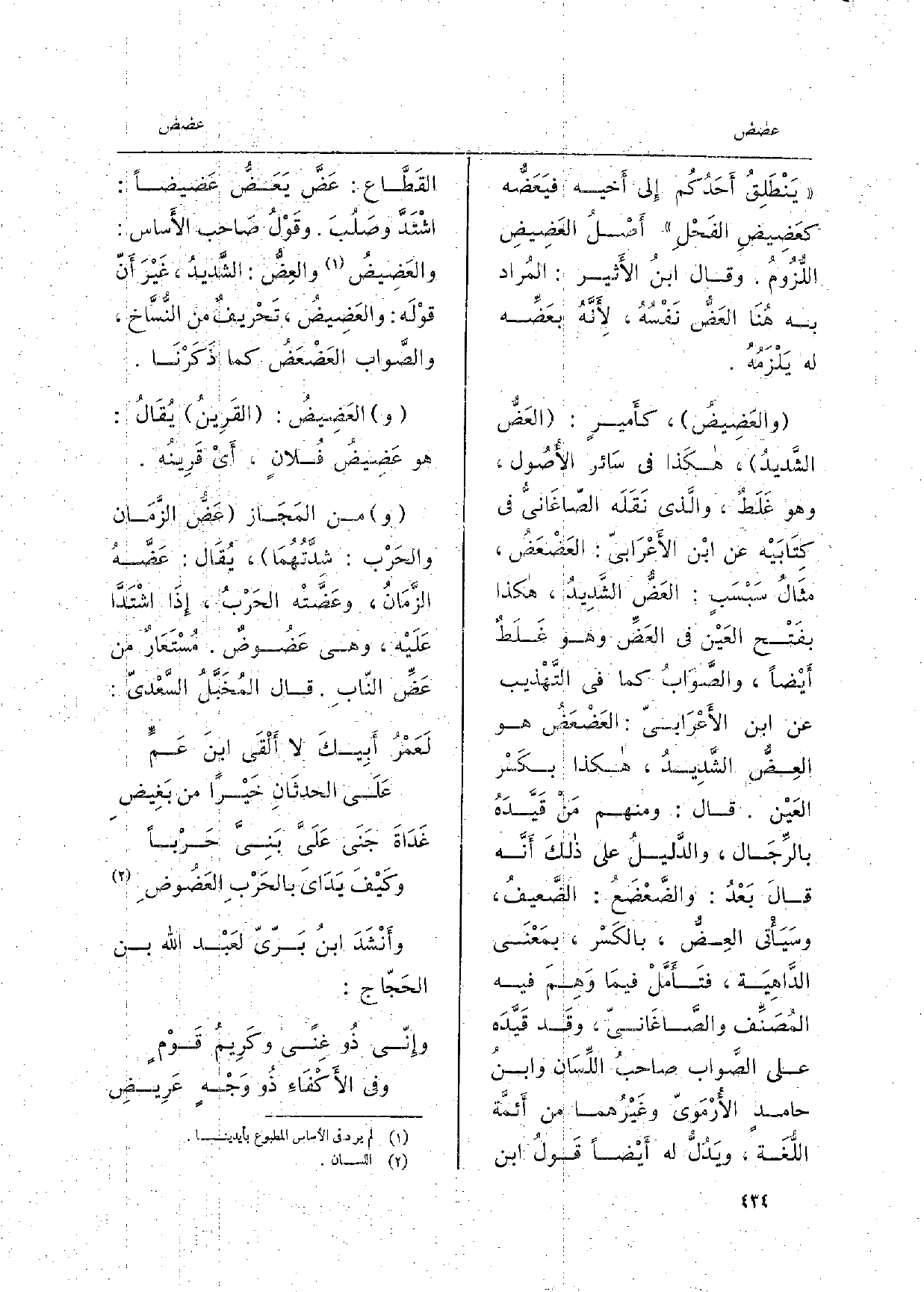 يَنْطَلِقُ أَحَدُكُم إِلى أَخيه {فيَعَضُّه} كعَضِيضِ الفَحْلِ أَصْلُ {العَضِيضِ اللُّزُومُ. وَقَالَ ابنُ الأَثير: المُراد بِهِ هُنَا العَضُّ نَفْسُهُ، لأَنَّهُ} بعَضِّه لَهُ يَلْزَمُهُ. {والعَضِيضُ، كأَميرٍ:} العَضُّ الشَّديدُ، هكَذا فِي سَائر الأُصُول، وَهُوَ) غَلَطٌ، والَّذي نَقَلَه الصّاغَانيُّ فِي كِتَابَيْه عَن ابْن الأَعْرَابيّ: {العَضْعَضُ، مثَالُ سَبْسَبٍ: العَضُّ الشَّدِيدُ، هَكَذَا بفَتْح العَيْن فِي العَضِّ وَهُوَ غَلَطٌ أَيْضاً، والصَّوَابُ كَمَا فِي التَّهْذيب عَن ابْن الأَعْرَابيّ: العَضْعَضُ هُوَ العِضُّ الشَّدِيدُ، هَكَذَا بكَسْر العَيْن. قَالَ: وَمِنْهُم مَنْ قَيَّدَهُ بالرِّجَال، والدَّليلُ على ذلكَ أَنَّه قالَ بَعْدُ: والضَّعْضَعُ: الضَّعيفُ، وسَيَأْتي العِضُّ، بالكَسْر، بمَعْنَى الدَّاهِيَة، فتَأَمَّلْ فيمَا وَهِمَ فِيهِ المُصَنِّف والصَّاغَانيّ، وقَد قَيَّدَه على الصَّواب صاحبُ اللِّسَان وابنُ حامدٍ الأُرْمَويّ وغَيْرُهما من أَئمَّة اللُّغَة، ويَدُلُّ لَهُ أَيْضاً قَولُ ابْن القَطَّاع:} عَضَّ {يَعَضُّ} عَضيضاً: اشْتَدَّ وصَلُبَ. وقَوْلُ صَاحب الأَساس: {والعَضِيضُ} والعِضُّ: الشَّديدُ، غَيْرَ أَنّ قوْلَه: {والعَضِيضُ، تَحْريفٌ من النُّسَّاخ، والصَّواب} العَضْعَضُ كَمَا ذَكَرْنَا. و {العَضِيضُ: القَرِينُ يُقَالُ: هُوَ عَضِيضُ فُلانٍ، أَيْ قَرِينُه. من المَجَاز عَضُّ الزَّمَان والحَرْب: شِدَّتُهُمَا، يُقَال:} عَضَّهُ الزَّمَانُ، {وعَضَّتْه الحَرْبُ، إِذَا اشْتَدّا عَلَيْه، وَهِي} عَضُوضٌ. مُسْتَعَارٌ من {عَضِّ النّابِ. قَالَ المُخْبَّلُ السَّعْديّ: