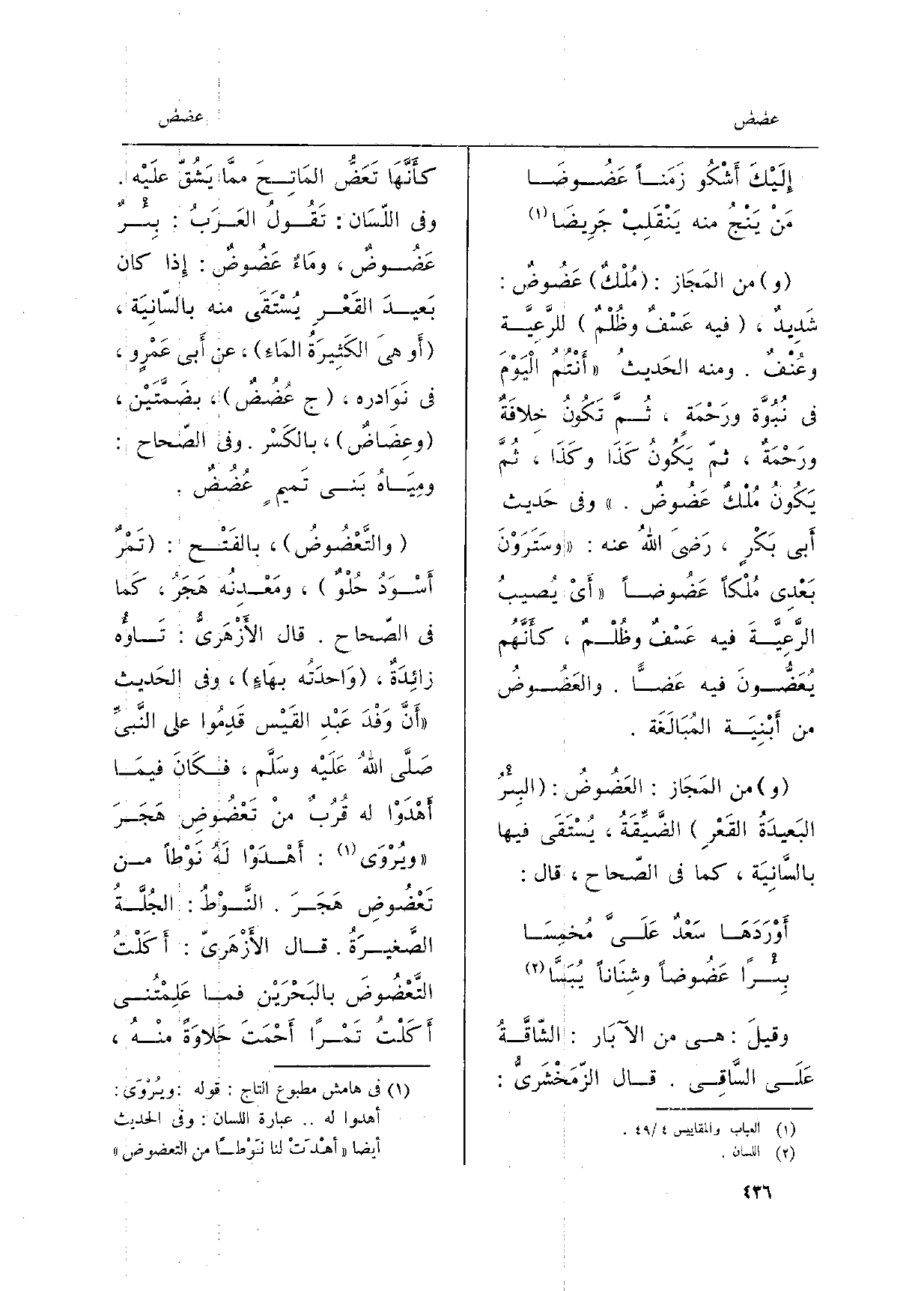 إِلَيْكَ أَشْكُو زَمَناً {عَضُوضَا مَنْ يَنْجُ مِنْهُ يَنْقَلِبْ جَرِيضَا من المَجَاز: مُلْكٌ} عَضُوضٌ: شَدِيدٌ، فِيهِ عَسْفٌ وظُلْمٌ للرَّعِيَّة وعُنْفٌ. وَمِنْه الحَديثُ أَنْتُمُ الْيَوْمَ فِي نُبُوَّة ورَحْمَةٍ، ثُمَّ تَكُونُ خِلافَةٌ ورَحْمَةٌ، ثمّ يَكُونُ كَذَا وكَذَا، ثُمَّ يَكُونُ مُلْكٌ {عَضُوضٌ. وَفِي حَديث أَبي بَكْرٍ، رَضيَ اللهُ عَنهُ: وسَتَرَوْنَ بَعْدي مُلْكاً} عَضُوضاً أَيْ يُصِيبُ الرَّعِيَّةَ فِيهِ عَسْفٌ وظُلْمٌ، كأَنَّهُم {يُعَضُّونَ فِيهِ} عَضّاً. {والعَضُوضُ من أَبْنِيَة المُبَالَغَة. من المَجَاز: العَضُوضُ: البِئْرُ البَعيدَةُ القَعْرِ الضَّيِّقَةُ، يُسْتَقَى فِيهَا بالسَّانِيَة، كَمَا فِي الصّحاح، قَالَ: أَوْرَدَهَا سَعْدٌ عَلَيَّ مُخمِسَا بِئْراً} عَضُوضاً وشِنَاناً يُبَسَّا وقيلَ: هِيَ من الآبَار: الشّاقَّةُ عَلَى السَّاقِي. قَالَ الزّمَخْشَريُّ: كأَنَّهَا تَعَضُّ المَاتِحَ ممَّا يَشُقّ علَيْه.