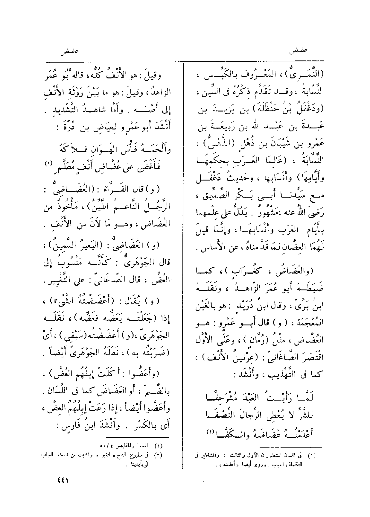 النَّمَرِيُّ. المَعْرُوف بالكَيِّس، النَّسّابَةُ، وَقد تَقَدَّم ذِكْرُهُ فِي السِّين، ودَغْفَلُ بْنُ حَنْظَلَةَ بن يَزيدَ بن عَبدةَ بن عَبْد الله بن رَبيعَةَ بن عَمْرو بن شَيْبَانَ بن ذُهْلٍ الذُّهْلِيُّ، النَّسَّابَةُ، عَالِمَا العَرَبِ بحِكَمِهَا وأَيَّامِهَا وأَنْسَابها، وحَديثُ دَغْفَل مَعَ سَيِّدنا أَبي بَكْر الصَّدِّيق، رَضيَ اللهُ عَنهُ، مَشْهُورٌ. يَدُلُّ على عِلْمهما بأَيّام العَرَب وأَنْسَابهَا، وإِنَّمَا قيلَ لهُمَا العِضَّانِ لمَا قَدَّمناهُ، عَن الأَساس. {والعُضَاضُ، كغُرَابٍ، كَمَا ضَبَطَه أَبو عُمَرَ الزَّاهدُ، ونَقَلَهُ ابنُ بَرِّيّ، وَقَالَ ابنُ دُرَيْدٍ: هُوَ بالغَيْن المُعْجَمَة، قَالَ أَبو عَمْرٍ و: هُوَ} العُضَّاض، مثْلُ رُمَّانٍ، وعَلَى الأَوَّل اقْتَصَرَ الصَّاغَانيّ: عِرْنينُ الأَنْف، كَمَا فِي التَّهْذيب، وأَنْشَد: لَمَّا رَأَيْتُ العَبْدَ مُشْرَحِفَّا للشَّرِّ لَا يُعْطِي الرِّجالَ النِّصْفَا أَعْدَمْتُهُ {عُضَاضَهُ والكَفَّا وقيلَ: هُوَ الأَنْفُ كُلُّه، قَالَه أَبُو عُمَر الزاهدُ، وقيلَ: هُوَ مَا بَيْنَ رَوْثَةِ الأَنْفِ إِلى أَصْله. وأَمَّا شاهدُ التَّشْديدِ. أَنْشَدَ أَبو عَمْرٍ ولِعيَاضِ بن دُرَّةَ: