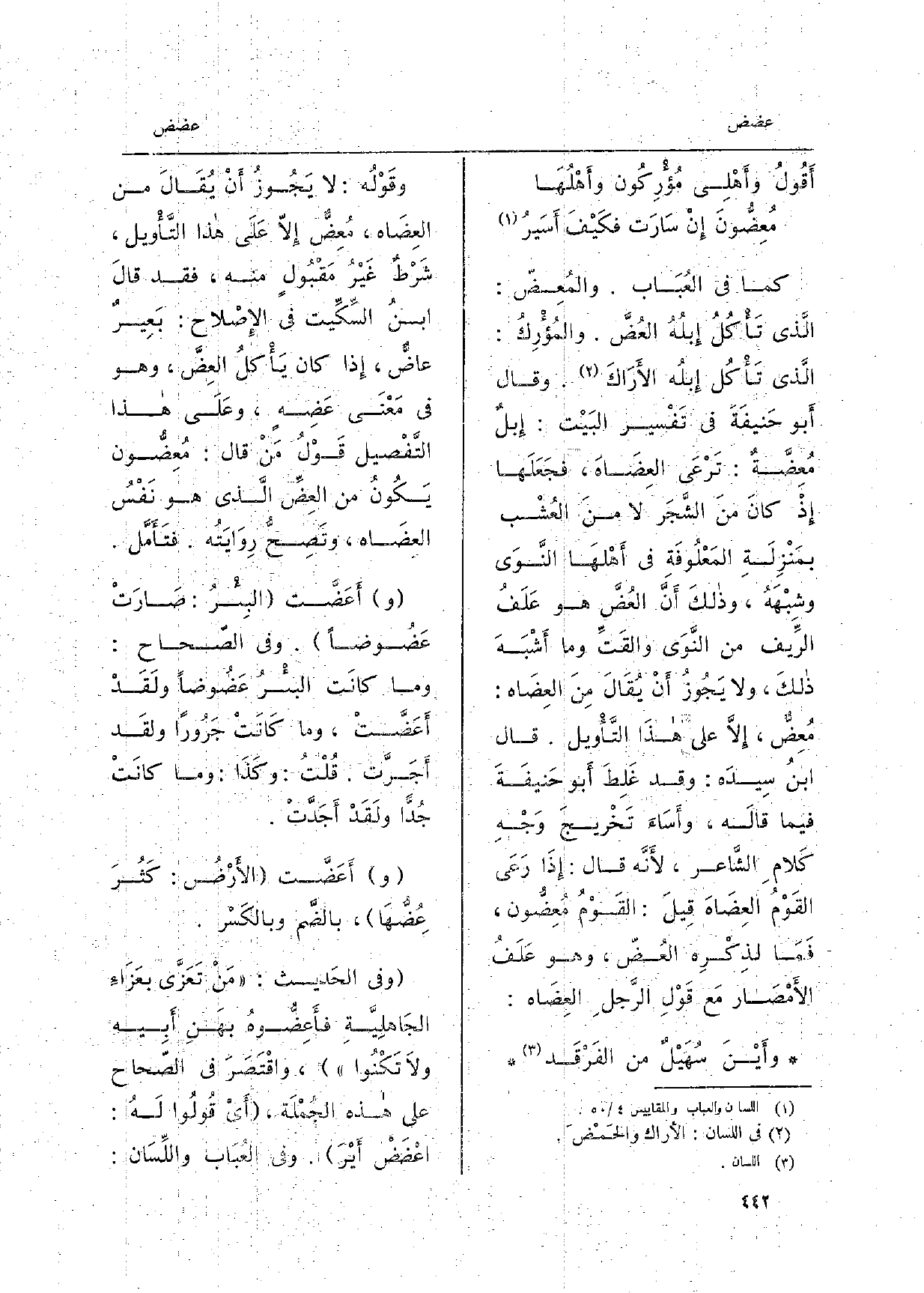 كَمَا فِي العُبَاب.} والمُعِضّ: الَّذي تَأْكُلُ إِبلُهُ {العُضَّ. والمُؤْرِكُ: الَّذي تَأْكُل إِبلُهُ العُضَّ. والمُؤْرِكُ: الَّذي تَأْكُل إِبلُه الأَرَاكَ. وَقَالَ أَبو حَنيفَةَ فِي تَفْسير البَيْت: إِبلٌ} مُعِضَّةٌ: تَرْعَى العِضَاهَ، فجَعَلَها إِذْ كانَ منَ الشَّجَر لَا منَ العُشْر بمَنْزِلَةِ المَعْلُوفَةِ فِي أَهْلهَا النَّوَى وشِبْهَهُ، وذلكَ أَنَّ العُضَّ هُوَ عَلَفُ الرِّيف من النَّوَى والقَتِّ وَمَا أَشْبَهَ ذلكَ، وَلَا يَجُوزُ أَنْ يُقَالَ مِنَ العِضَاه: {مُعِضٌّ، إِلاَّ على هذَا التَّأْويل. قَالَ ابنُ سِيدَه: وَقد غَلِطَ أَبو حَنيفَةَ فِيمَا قالَه، وأَسَاءَ تَخْريجَ وَجْهِ كَلامِ الشَّاعر، لأَنَّه قَالَ: إِذَا رَعَى كَلامِ الشَّاعر، لأَنَّه قَالَ: إِذَا رَعَى القَوْمُ العِضَاهَ قِيلَ: القَوْمُ مُعِضُّون، فَمَا لذِكْرِه العُضّ، وَهُوَ عَلَفُ الأَمْصَار مَع قَوْلِ الرَّجلِ العِضَاه: وأَيْنَ سُهَيْلٌ من الفَرْقَد وقَوْلُه: لَا يَجُوزُ أَنْ يُقَالَ من العِضَاه، مُعِضٌّ إِلاّ عَلَى هَذَا التَّأْويل، شَرْطٌ غَيْرُ مَقْبُولٍ مِنْهُ، فقد قالَ ابنُ السِّكِّيت فِي الإِصْلاح: بَعِيرٌ عاضٌّ، إِذا كَانَ يَأْكلُ العِضَّ، وَهُوَ فِي مَعْنَى عَضِهِ، وعَلَى هَذَا التَّفْصيل قَوْلُ مَنْ قَالَ: مُعِضُّون يَكُونُ من العِضِّ الَّذي هُوَ نَفْسُ العِضَاه، وتَصِحُّ رِوَايَتُه.