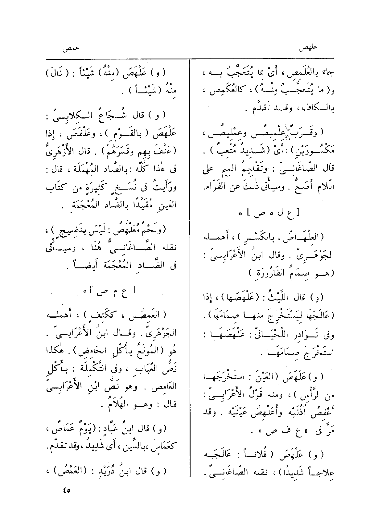 العِلْهَاصُ، بالكَسْرِ، أَهمله الجَوْهَرِيّ. وَقَالَ ابنُ الأَعْرَابِيّ: هُوَ صِمَامُ القَارُورَةِ قَالَ اللَّيثُ: عَلْهَصَها، إِذا عَالَجَها لِيَسْتَخْرِجُ مِنْهَا صِمَامَهَا. وَفِي نَوَادِر اللِّحْيَانِيّ: عَلْهَصَهَا: استَخْرَجَ صِمَامَهَا. عَلْهَصَ العَيْنَ: استَخْرَجَها من الرَّأْسِ، وَمِنْه قَوْلُ الأَعْرَابِيّ: أَعْفِصُ أُذُنَيْه وأُعَلْهِصُ عَيْنَيْه. وَقد مَرَّ فِي ع ف ص. عَلْهَصَ فُلاناً: عَالَجَه عِلاجاً شَدِيداً، نَقله الصّاغَانِيّ. عَلْهَصَ مِنْهُ شَيْئاً: نَالَ مِنْهُ شَيْئاً. قَالَ شُجَاعٌ الكِلابِيّ: عَلْهَصَ بالقَوْمِ، وعَلْفَصَ، إِذ عَنَّفَ بِهِم وقَسَرَهُمْ. قَالَ الأَزْهَرِيُّ فِي هَذَا كُلّه: بالصَّاد المُهْمَلَة، قَالَ: ورَأَيتُ فِي نُسَخٍ كَثِيرَةٍ من كتَاب العَيْنِ مُقَيَّداً بالضَّاد المُعْجَمَةِ. ولَحْمٌ مُعَلْهَصٌ: لَيْسَ بنَضِيجٍ، نَقله الصَّاغَانِيُّ هُنَا، وسيأْتي فِي الضَّادِ المُعْجَمَة أَيضاً.