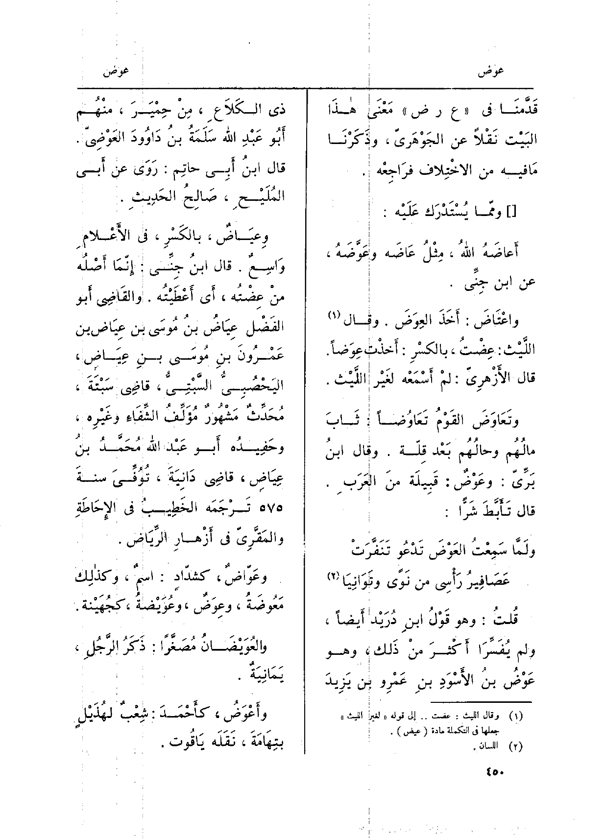 قُلتُ: وَهُوَ قَوْلُ ابنِ دُرَيْد أَيضاً، وَلم يُفَسِّرَا أَكْثرَ منْ ذَلك، وَهُوَ عَوْضُ بنُ الأَسْوَدِ بنِ عَمْرِو بن يَزِيدَ ذِي الكَلاَعِ، مِنْ حِمْيَرَ، منْهُم أَبُو عَبْدِ الله سَلَمَةُ بنُ دَاوُودَ العَوْضِيّ. قَالَ ابنُ أَبي حاتِم: رَوَى عَن أَبي المُلَيْحِ، صَالِحُ الحَدِيثِ. {وعِيَاضٌ، بالكًسْرِ، فِي الأَعْلامِ وَاسِعٌ. قَالَ ابنُ جِنِّي: إِنَّمَا أَصْلُه منْ عِضْتُه، أَي أَعْطَيْتُه. والقَاضِي أَبو الفَضْل عِيَاضُ بنُ مُوسَى بن عِيَاض بن عَمْرُونَ بنِ مُوسَى بنِ عِيَاضٍ، اليَحْصُبِيُّ السَّبْتِيُّ، قاضِي سَبْتَةَ، مُحَدِّثٌ مَشْهُورٌ مُؤَلِّفُ الشِّفَاءِ وغَيْرِه، وحَفِيدُه أَبو عَبْد الله مُحَمَّدُ بنُ عِيَاضٍ، قاضِي دَانِيَةَ، تُوُفِّيَ سنةَ تَرْجَمَه الخَطِيبُ فِي الإِحَاطَةِ والمَقَّرِيّ فِي أَزْهارِ الرِّيَاض.} وعَوّاضٌ، كشدّادٍ: اسمٌ، وكذلِك {مَعُوضَةُ،} وعِوَضٌ، {وعُوَيْضةُ، كجُهَيْنة.} والعُوَيْضَانُ مُصَغَّراً: ذَكَرُ الرَّجُلِ، يَمَانِيَةٌ.! وأَعْوَضُ، كأَحْمَدَ: شِعْبٌ لهُذَيْلٍ بتِهَامَةَ، نَقَلَه يَاقُوت.