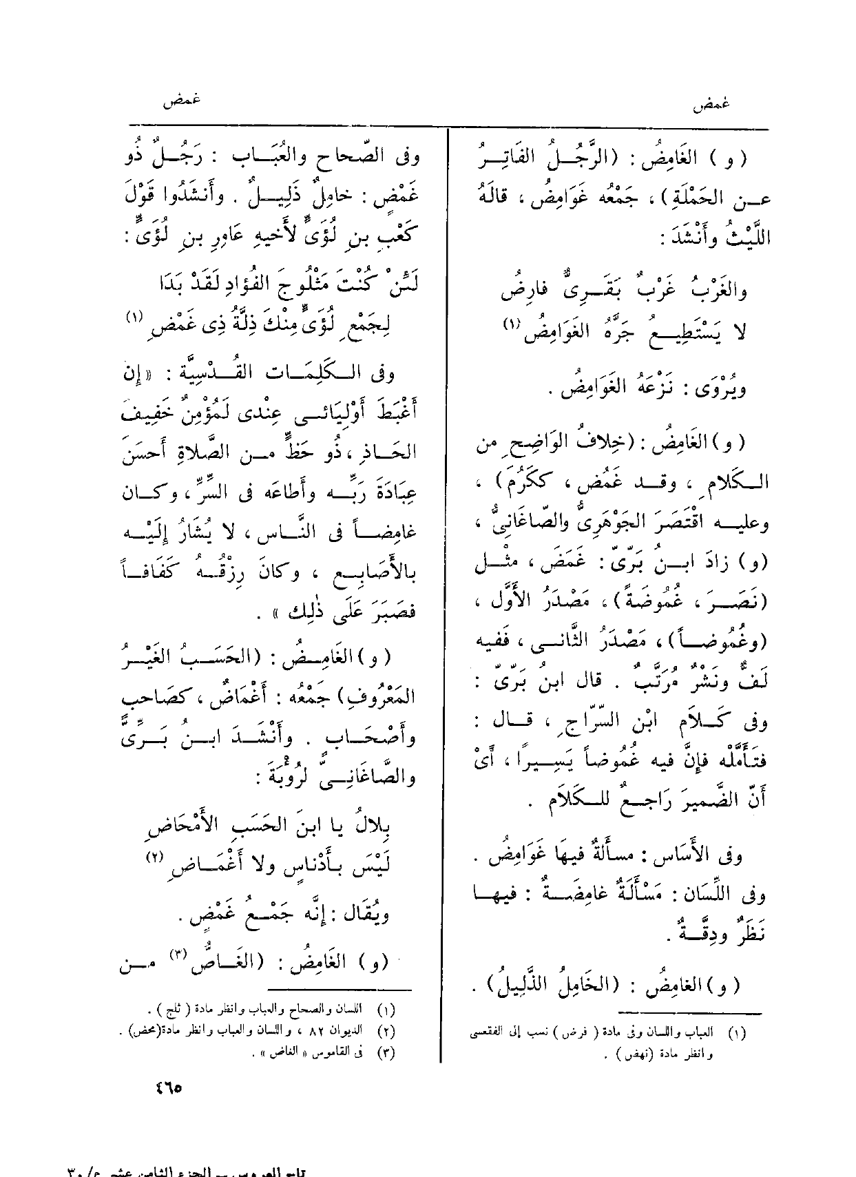 الغَامِضُ: الرَّجُلُ الفَاتِرُ عَن الحَمْلَةِ، جَمْعُه غَوَامِضُ، قالَهُ اللَّيْثُ وأَنْشَدَ: والغَرْبُ غَرْبٌ بَقَرِيٌّ فارِضُ لَا يَسْتَطِيعُ جَرَّهُ الغَوَامِضُ ويُرْوَى: نَزْعَهُ الغَوَامِضُ. الغَامِضُ: خِلافُ الوَاضِحِ من الكَلامِ، وَقد غَمُض، ككَرُمَ، وَعَلِيهِ اقْتَصَرَ الجَوْهَرِيُّ والصَّاغَانيُّ، زادَ ابنُ بَرّيّ: غَمَضَ، مثْل نَصَرَ، غُمُوضَةً، مَصْدَرُ الأَوَّل، وغُمُوضاً، مَصْدَرُ الثَّاني، فَفيه لَفٌّ ونَشْرٌ مُرَتِّبٌ. قَالَ ابنُ بَرِّيّ: وَفِي كَلاَم ابْن السّرّاجِ، قَالَ: فتَأَمَّلْه فإِنَّ فِيهِ غُمُوضاً يَسِيراً، أَي أَنّ الضَّميرَ رَاجعٌ للكَلاَم. وَفِي الأَسَاس: مسأَلةٌ فيهَا غَوَامِضُ. وَفِي اللِّسَان: مَسْأَلَةٌ غامِضَةٌ: فِيهَا نَظَرٌ ودِقَّةٌ. الغامِضُ: الخَامِلُ الذَّلِيلُ. وَفِي الصّحاح والعُبَاب: رَجُلٌ ذُو غَمْضٍ: خامِلٌ ذَلِيلٌ. وأَنشَدُوا قَوْلَ كَعْبِ بنِ لُؤَيٍّ لأَخيهِ عَامِرِ بنِ لُؤَيٍّ: وَفِي الكَلِمَات القُدْسِيَّة: إِن أَغْبَطَ أَوْلِيَائي عِنْدي لَمُؤْمِنٌ خَفِيفَ الحَاذِ، ذُو حَظٍّ من الصَّلاةِ أَحسَنَ عِبَادَةَ رَبِّه وأَطاعَه فِي السِّرِّ، وَكَانَ غامِضاً فِي النَّاس، لَا يُشَارُ إِلَيْه بالأَصَابِع، وكانَ رِزْقُهُ كَفَافاً فصَبَرَ عَلَى ذلِك. الغَامِضُ: الحَسَبُ الغَيْرُ المَعْرُوفِ جَمْعُه: أَغْمَاضٌ، كصَاحبٍ وأَصْحَابٍ. وأَنْشَدَ ابنُ بَرِّيّ والصَّاغَانِيّ لرُؤْبَةَ: بِلالُ يَا ابنَ الحَسَبِ الأَمْحَاضِ) لَيْسَ بأَدْناسٍ وَلَا أَغْمَاضِ ويُقَال: إِنَّه جَمْعُ غَمْضٍ. الغَامِضُ: الغَاضُّ من