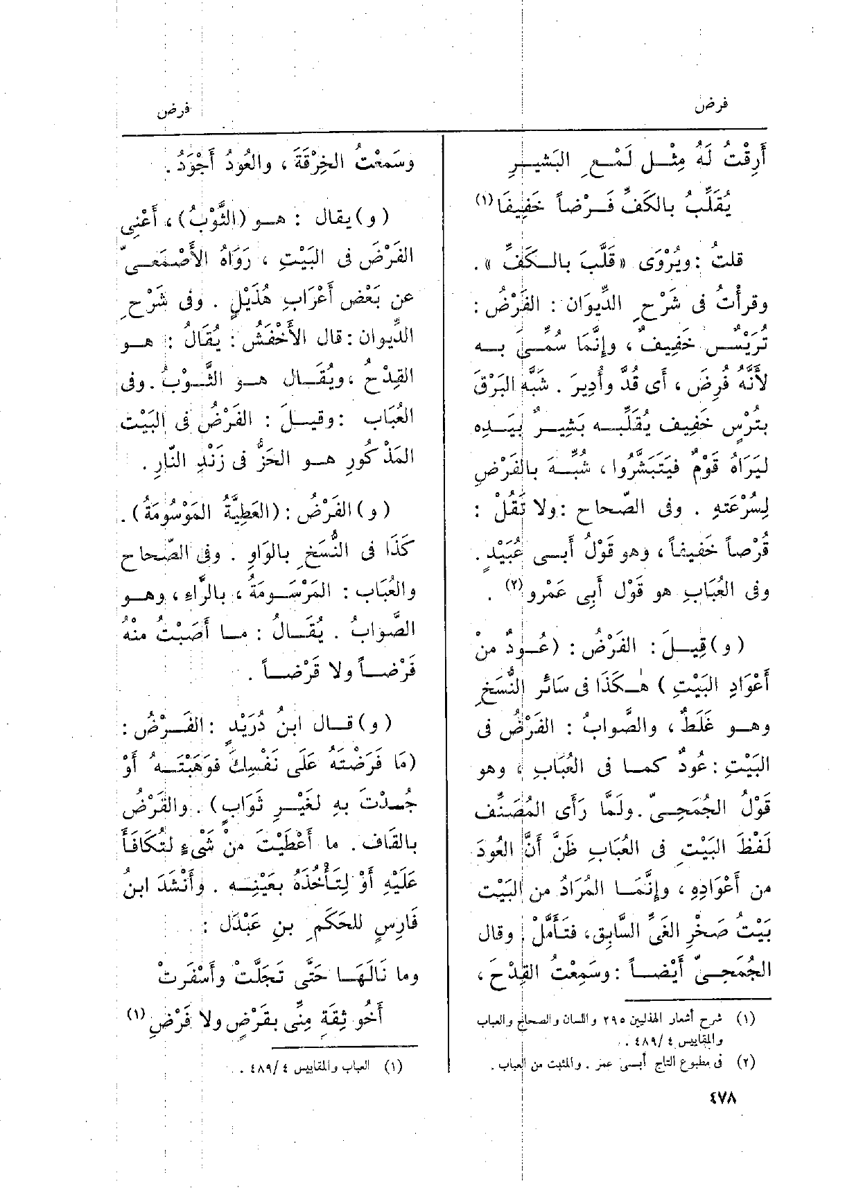 قلتُ: ويُرْوَى قَلَّبَ بالكَفِّ. وقرأْتُ فِي شَرْحِ الدِّيَوان: الفَرْضُ: تُرَيْسٌ خَفِيفٌ، وإِنَّمَا سُمِّيَ بِهِ لأَنَّهُ فُرِضَ، أَي قُدَّ وأُدِيرَ. شَبَّه البَرْقَ بتُرْسٍ خَفيف يُقَلِّبه بَشِيرٌ بيَدِه لَيَرَاهُ قَوْمٌ فيَتَبَشَّرُوا، شُبِّهَ بالفَرْضِ لِسُرْعَتِه. وَفِي الصّحاح: وَلَا تَقُلْ: قُرْصاً خَفيفاً، وَهُوَ قَوْلُ أَبي عُبَيْدٍ. وَفِي العُبَابِ هُوَ قَوْل أَبِي عَمْرو. قِيلَ: الفَرْضُ: عُودٌ منْ أَعْوَادِ البَيْتِ هكَذَا فِي سَائِر النُّسَخِ وَهُوَ غَلَطٌ، والصَّوابُ: الفَرْضُ فِي البَيْتِ: عُودٌ كَمَا فِي العُبَابِ، وَهُوَ قَوْلُ الجُمَحِيّ. ولَمَّا رَأَى المُصَنِّف لَفْظَ البَيْتِ فِي العُبَابِ ظَنَّ أَنَّ العُودَ من أَعْوَادِهِ، وإِنَّمَا المُرَادُ من البَيْت بَيْتُ صَخْرِ الغَيِّ السَّابِق، فتَأَمَّلْ. وَقَالَ الجُمَحِيّ أَيْضاً. وسَمِعْتُ القِدْحَ، وسَمعْتُ الخِرْقَةَ، والعُودُ أَجْوَدُ. يُقَال: هُوَ الثَّوْبُ، أَعْنِي الفَرْضَ فِي البَيْتِ، رَوَاهُ الأَصْمَعيّ عَن بَعْض أَعْرَابِ هُذِيْلٍ. وَفِي شَرْحِ الدِّيوان: قَالَ الأَخْفَشُ: يُقَالُ: هُوَ القِدْحُ، ويُقَال هُوَ الثَّوْبُ. وَفِي العُبَاب: وقيلَ: الفَرْضُ فِي البَيْع المَذْكُورِ هُوَ الحَزُّ فِي زَنْدِ النّارِ. الفَرْضُ: العَطِيَّةُ المَوْسُومَةُ. كَذَا فِي النُّسَخِ بالوَاوِ. وَفِي الصّحاح والعَبَاب: المَرْسُومَةُ، بالرَّاءِ، وَهُوَ الصَّوابُ. يُقَالُ: مَا أَصَبْتُ منْهُ فَرْضاً وَلَا قَرْضاً.