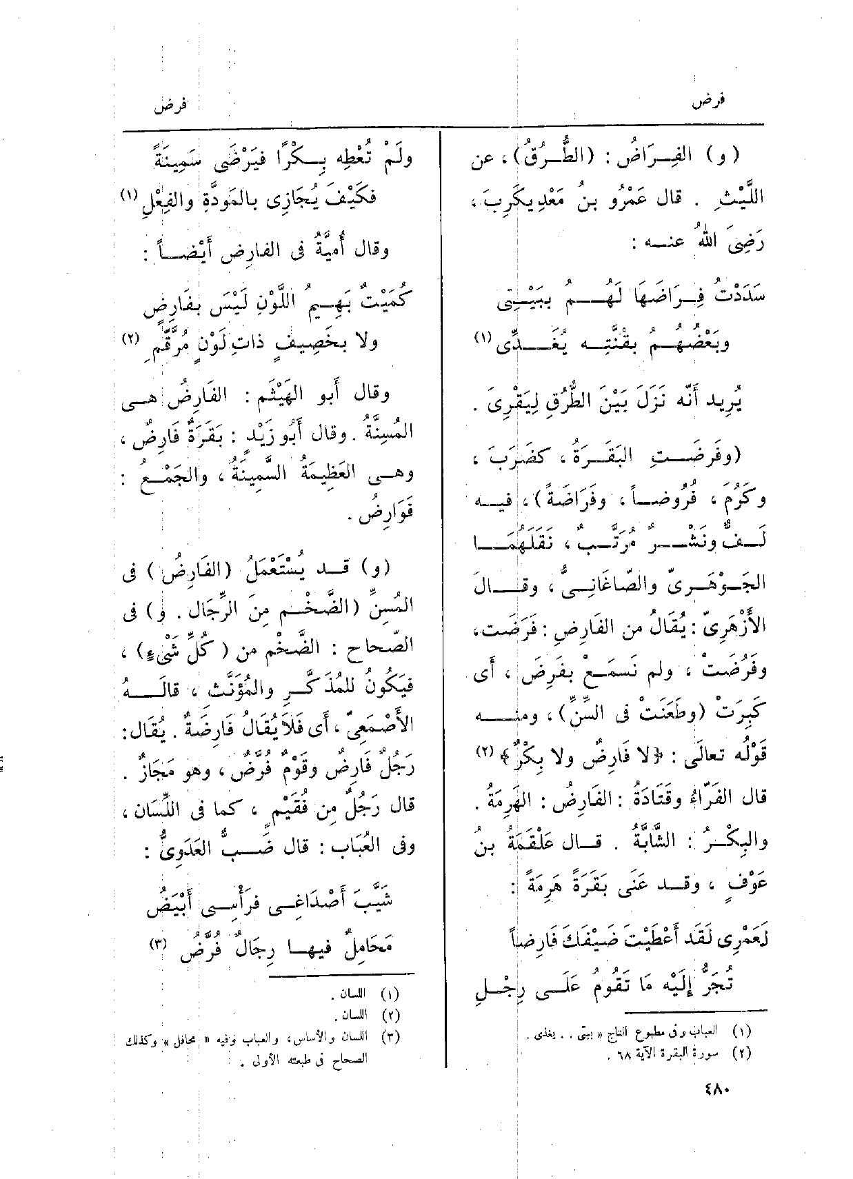 يُرِيد أَنَّه نَزَلَ بَيْنَ الطُّرُقِ لِيَقْرِيَ. وفَرضَتْ البَقَرَةُ، كضَرَبَ، وكَرُمَ، فُرُوضاً، وفَرَاضَةً، فِيهِ لَفٌّ ونَشْرٌ مُرَتَّبٌ، نَقَلَهُمَا الجَوْهَريّ والصّاغَانِيُّ، وقالَ الأَزْهَرِيّ: يُقَالُ من الفَارِضِ: فَرَضَت، وفَرُضَتْ، وَلم نَسمَعْ بفَرِضَ، أَي كَبِرَتْ وطَعَنَتْ فِي السَّنِّ، وَمِنْه قَوْلُه تعالَى: لَا فَارِضٌ وَلَا بِكْرٌ قَالَ الفَرّاءُ وقَتَادَةُ: الفَارِضُ: الهَرِمَةُ. والبِكْرُ: الشَّابَّةُ. قَالَ عَلْقَمَةُ بنُ عَوْفٍ، وَقد عَنَى بَقَرَةً هَرِمَةً: