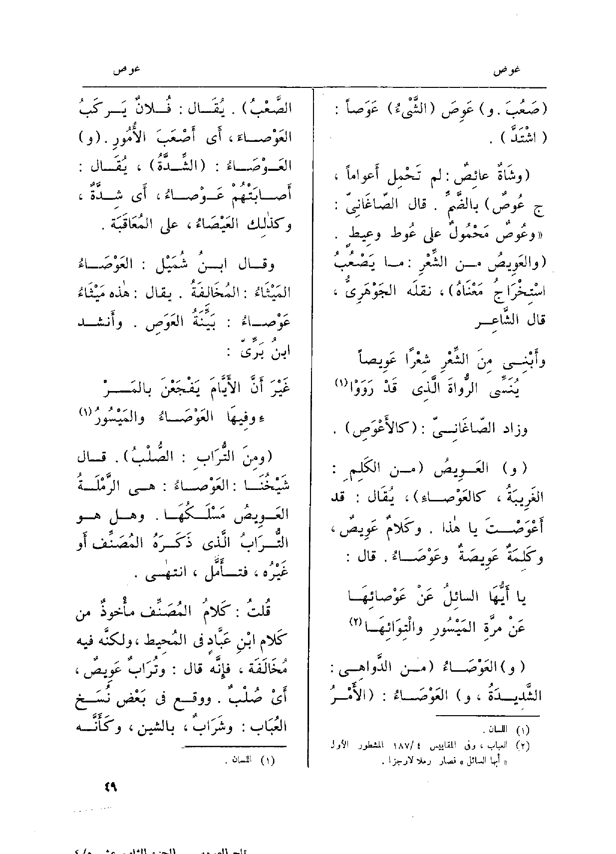 وَزَاد الصّاغَانيّ:} كالأَعْوَص. و {العَوِيصُ من الكَلمِ: الغَرِيبَةُ،} كالعَوْصَاءِ، يُقَال: قد {أَعْوَصْتَ يَا هَذَا. وكَلامٌ عَوِيصٌ، وكَلمَةٌ} عَوِيصَةٌ {وعَوْصَاءُ. قَالَ: يَا أَيُّهَا السائلُ عَنْ} عَوْصائهَا عَنْ مرَّة المَيْسُور والْتوَائهَا و {العَوْصَاءُ من الدَّواهي: الشَّديدَةُ، و} العَوْصَاءُ: الأَمْرُ الصَّعْبُ. يُقَال: فُلانٌ يَركَبُ العَوْصاءَ، أَي أَصْعَبَ الأُمُور. العَوْصَاءُ: الشِّدَّة، يُقَال: أَصابَتْهُمْ {عَوْصاءُ، أَي شدَّةٌ، وَكَذَلِكَ العَيْصَاءُ، على المُعَاقَبَة. وَقَالَ ابنُ شُمَيْل:} العَوْصَاءُ المَيْثَاءُ: المُخَالِفَةُ. يُقَال: هَذِه مَيْثَاءُ {عَوْصاءُ: بَيِّنَةُ} العَوَص. وأَنشد ابنُ بَرِّيّ: